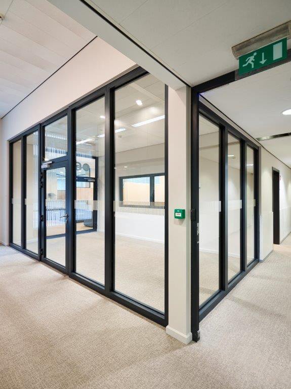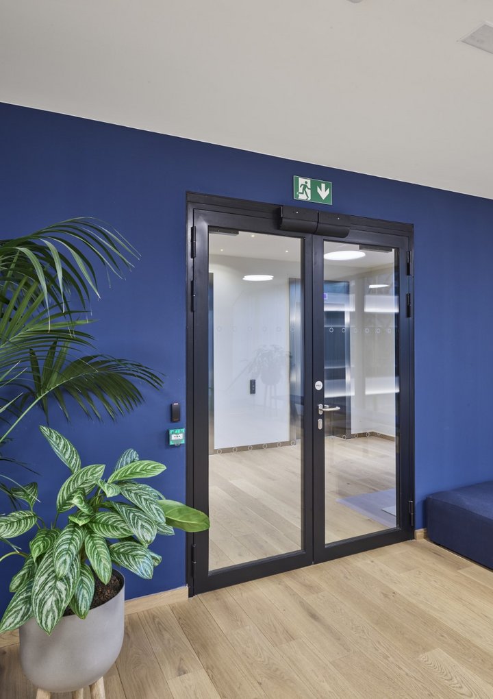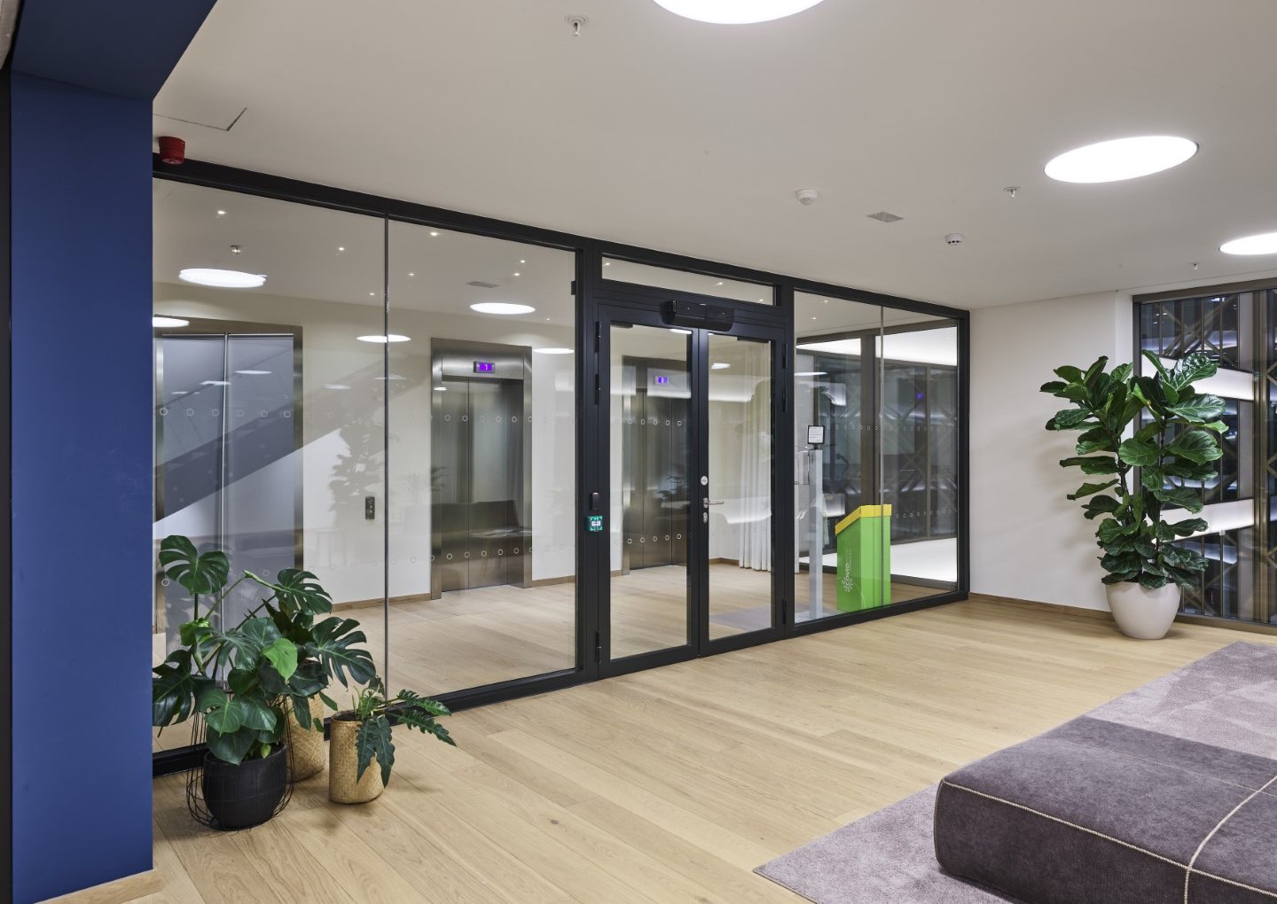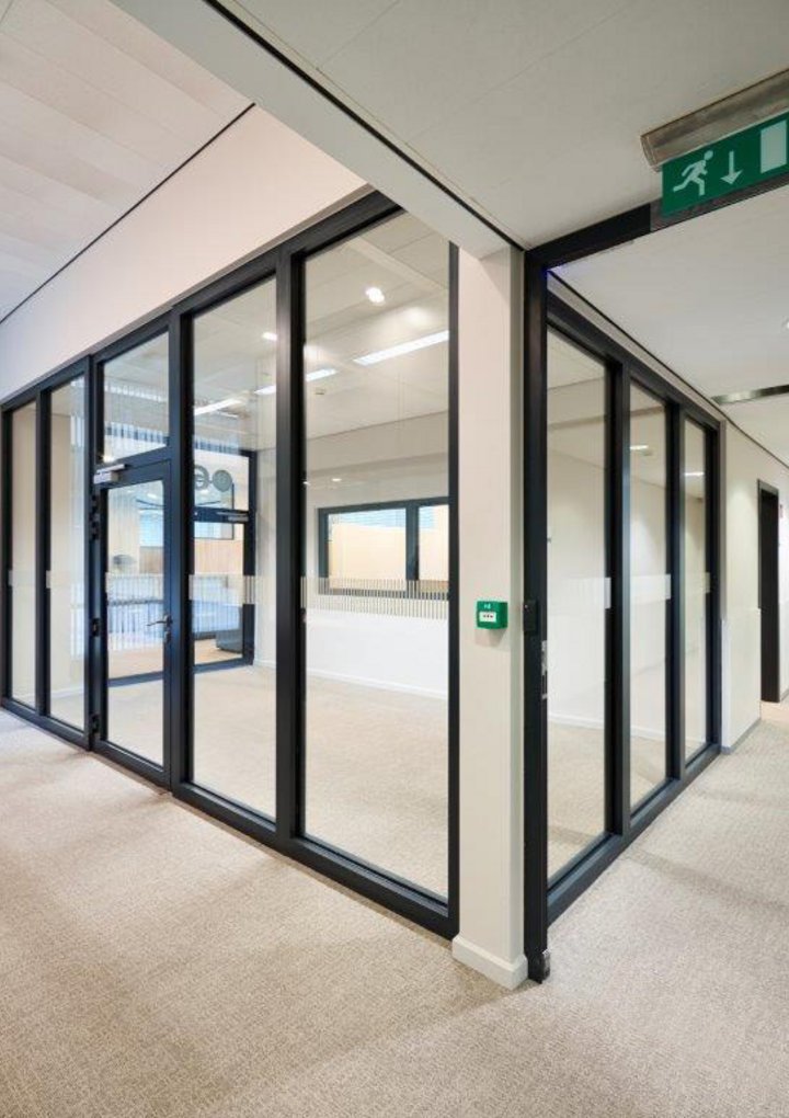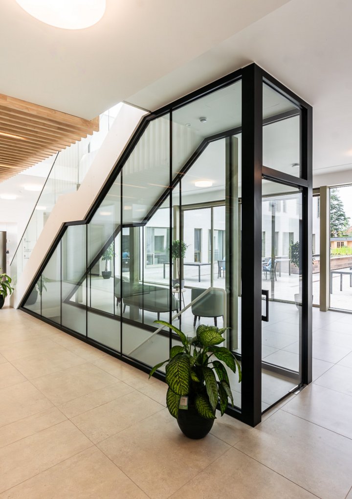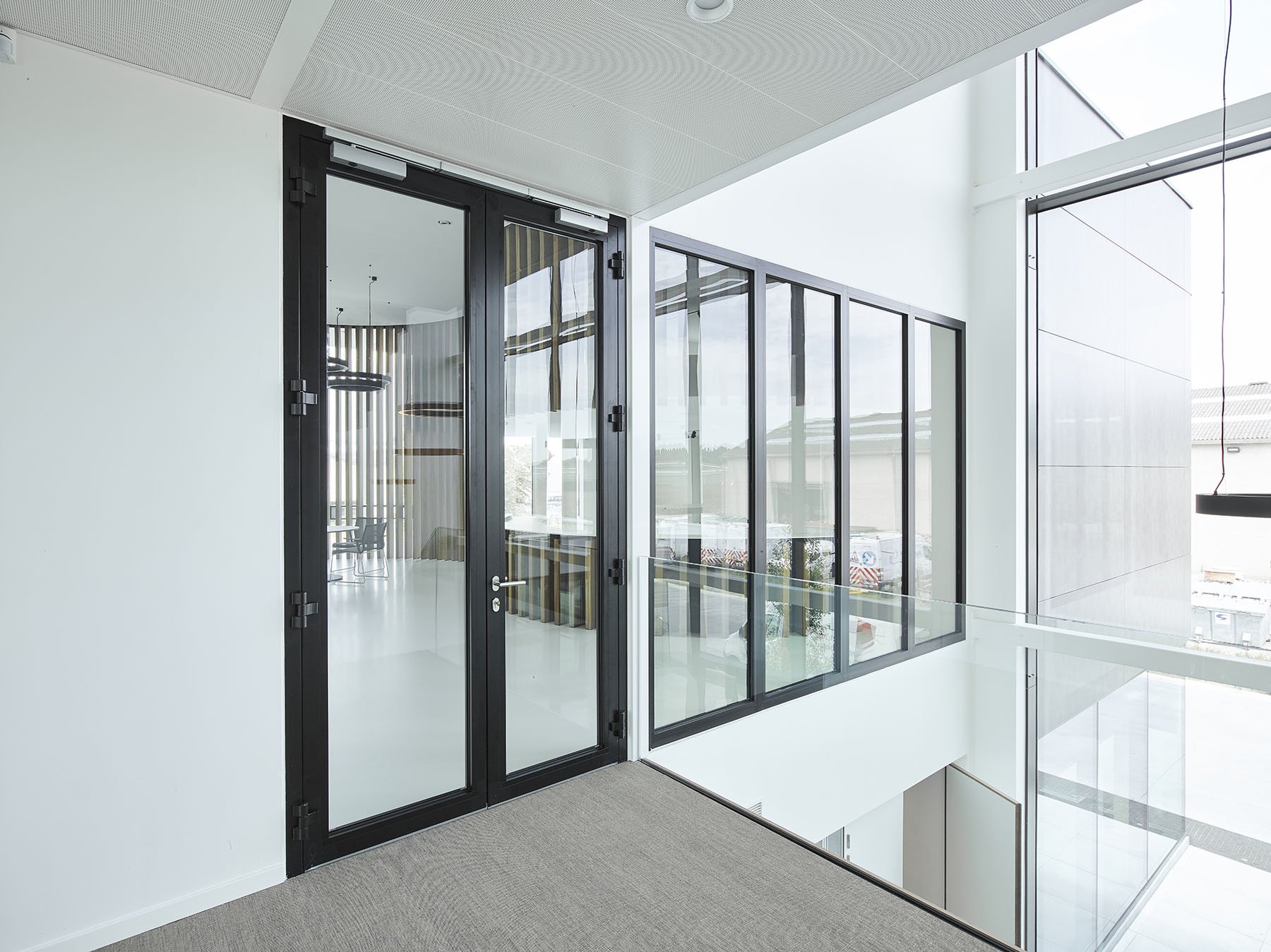 Mit JB FIREGLASS von Beddeleem bleibt die Offenheit des Gebäudes erhalten. Die transparenten Module und Türelemente dieses Systems lassen das Gebäudeinnere optisch größer wirken. Gleichzeitig sorgt das System für Sicherheit, da Brandschutzbereiche im Gebäude organisiert und geeignete Fluchtwege für die Evakuierung von Personen gewährleistet werden können.