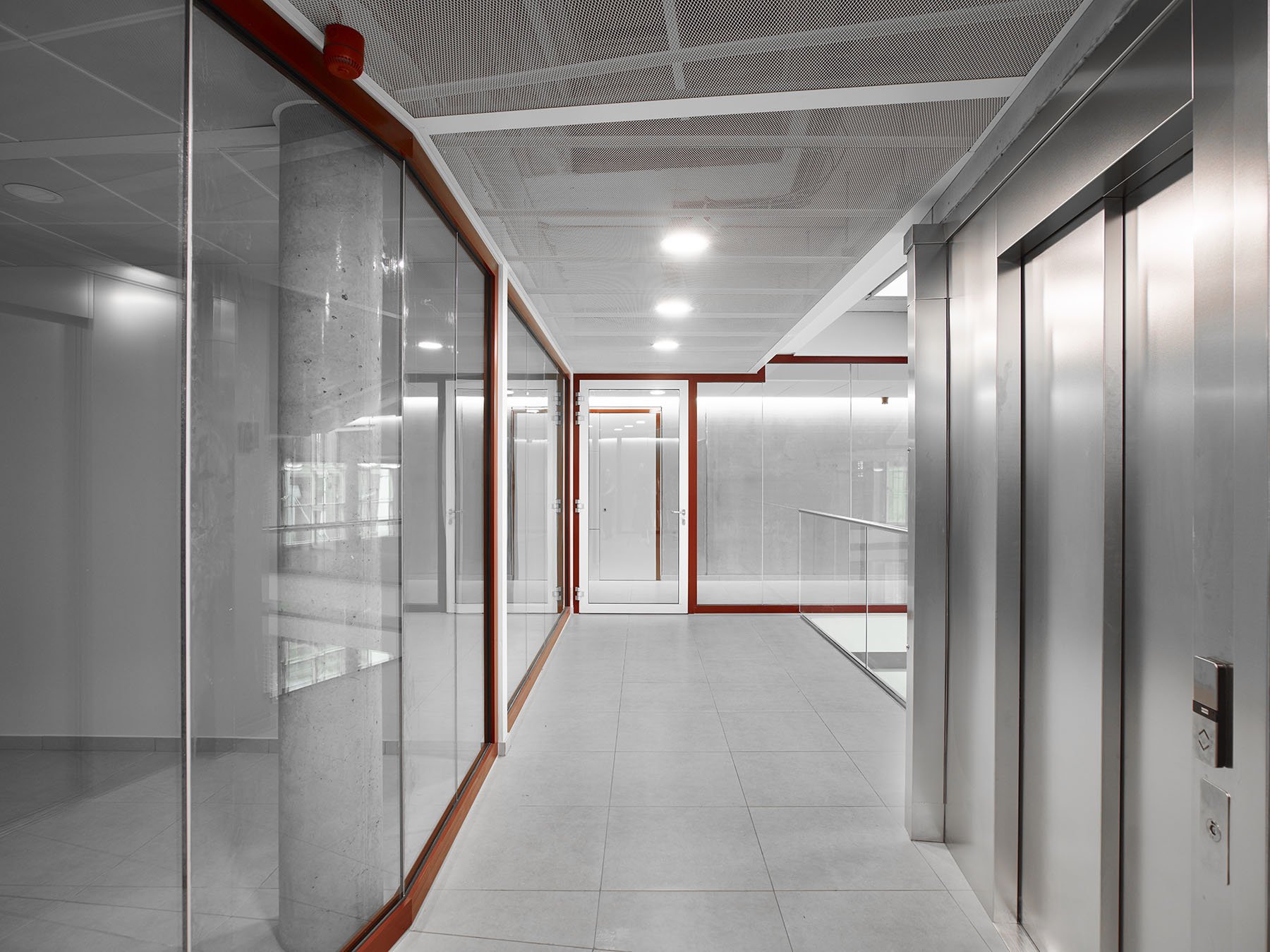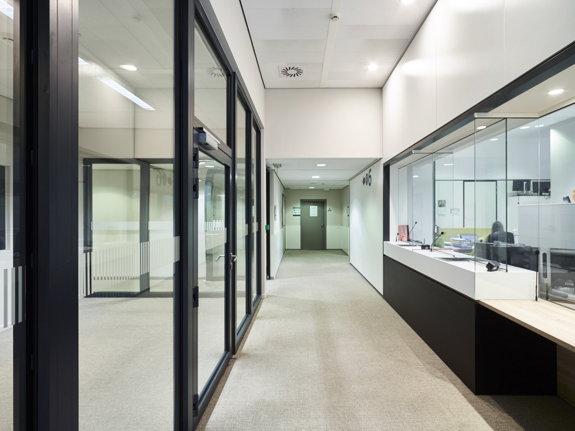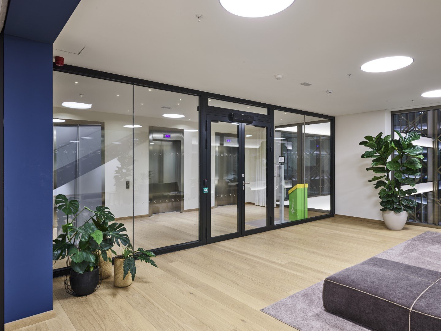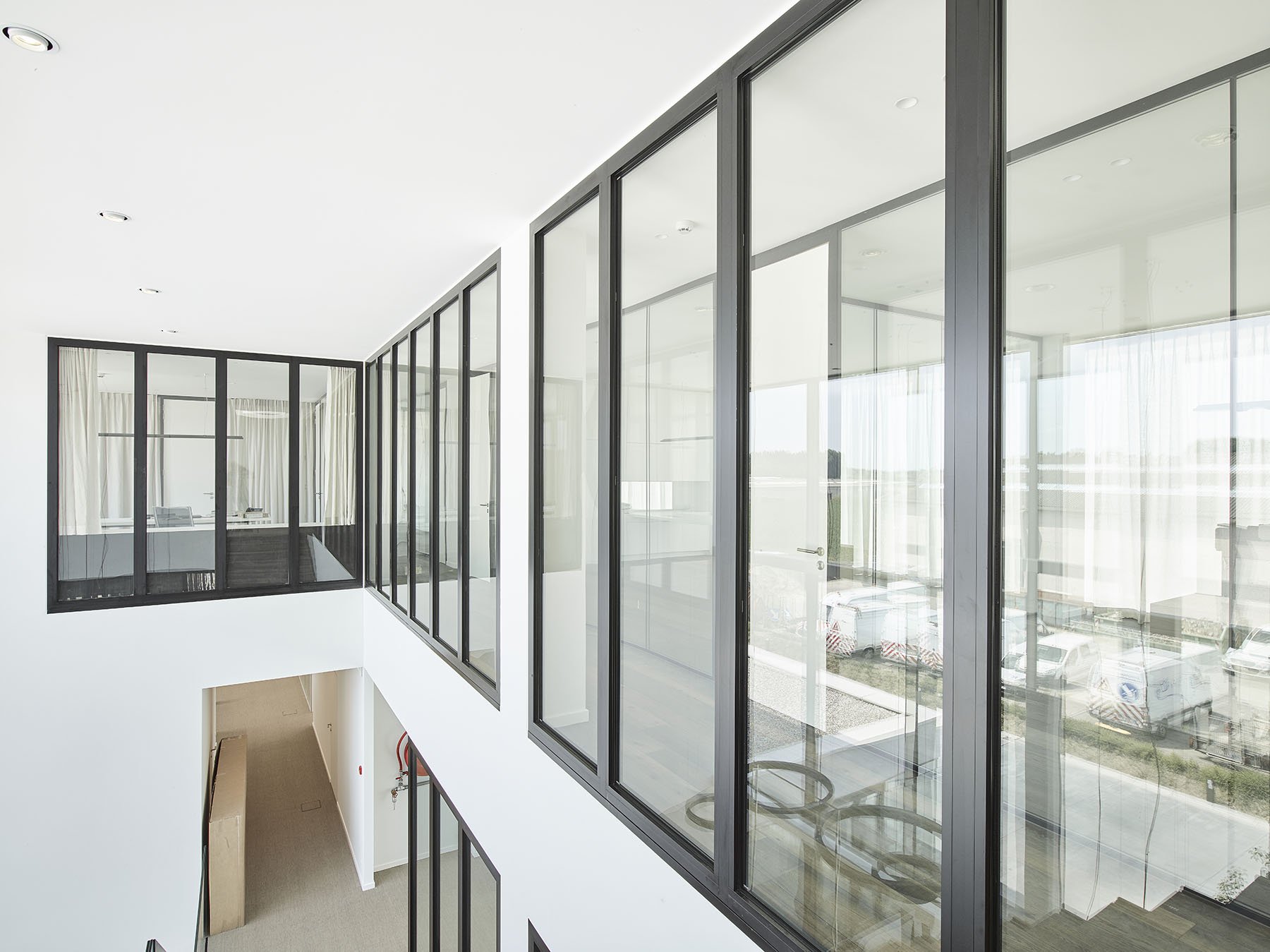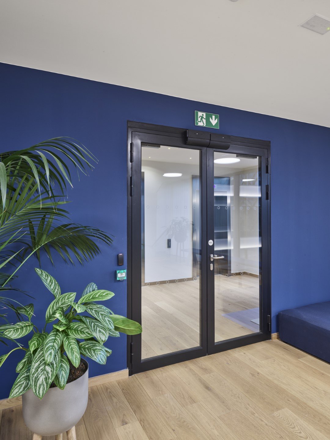 Mit JB FIREGLASS von Beddeleem bleibt die Offenheit des Gebäudes erhalten. Die transparenten Module und Türelemente dieses Systems lassen das Gebäudeinnere optisch größer wirken. Gleichzeitig sorgt das System für Sicherheit, da Brandschutzbereiche im Gebäude organisiert und geeignete Fluchtwege für die Evakuierung von Personen gewährleistet werden können.