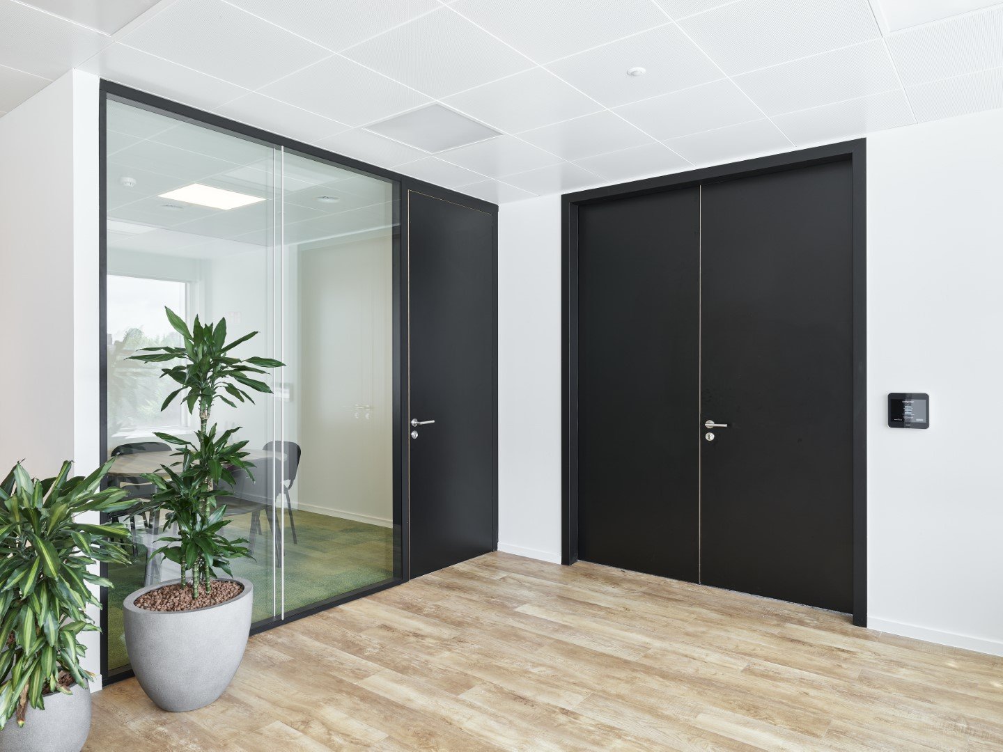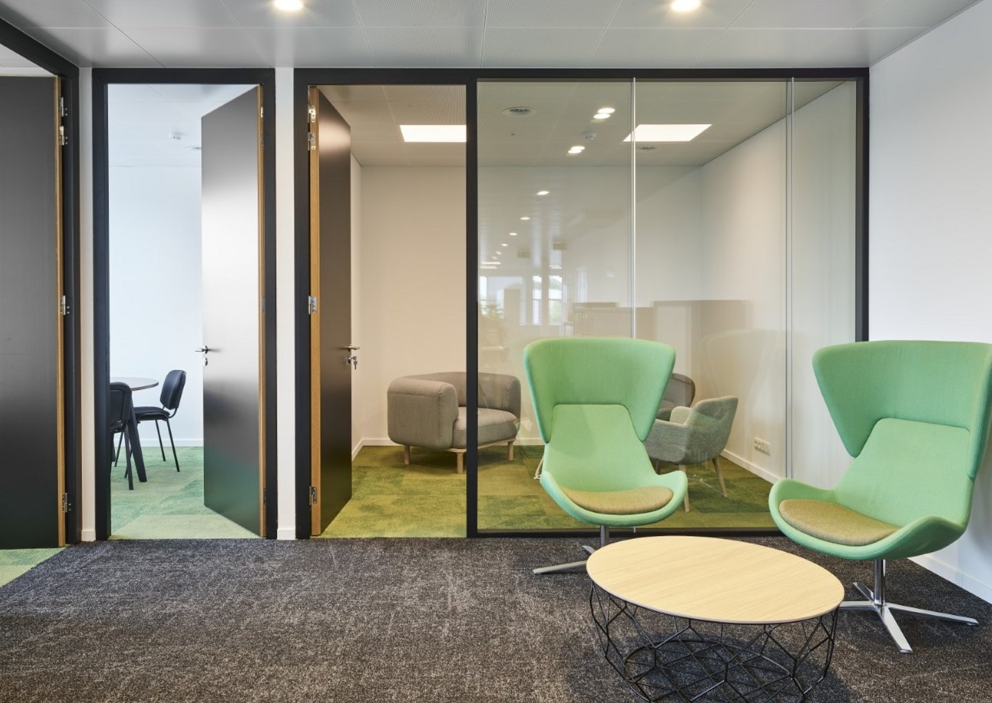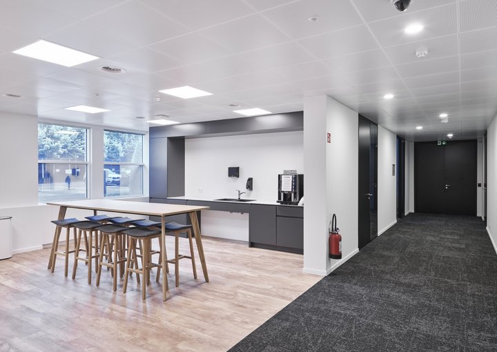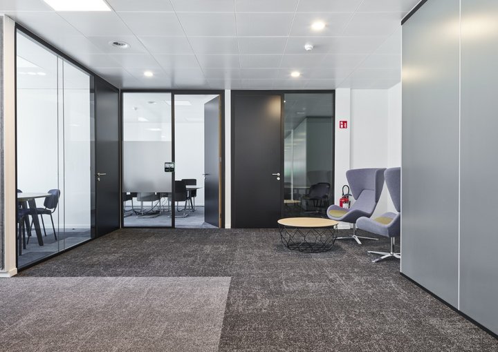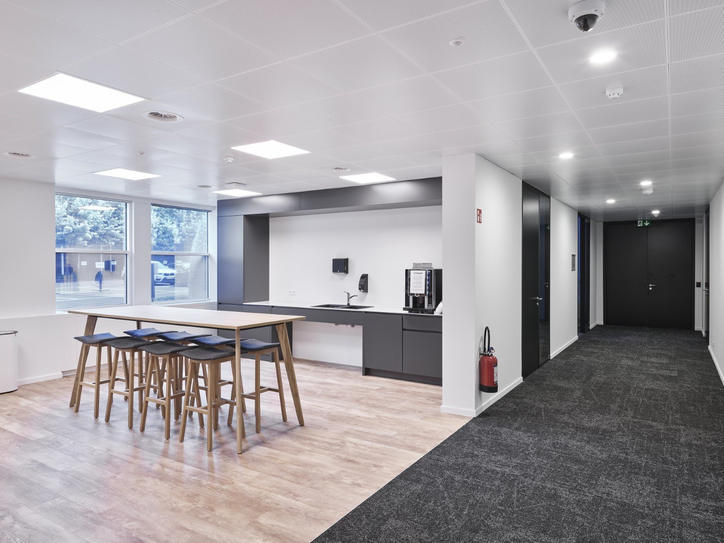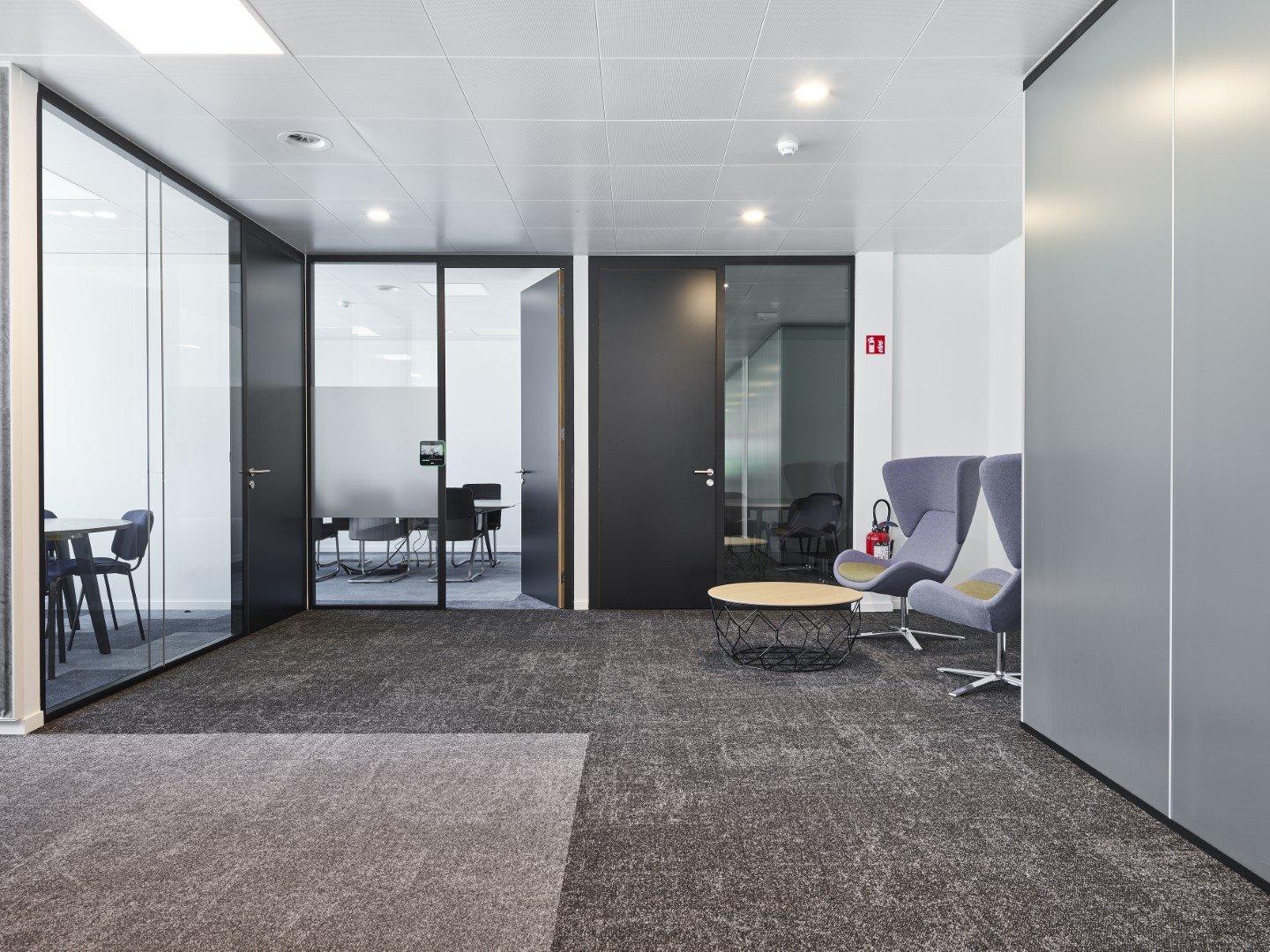 Total fit-out with plasterboard partitions, ceilings and luminaries, floor coverings (carpet - vinyl - epoxy), tiling, painting, electricity, sanitary, outside works (movable bollards, garage door, anti-burglary foil, security)