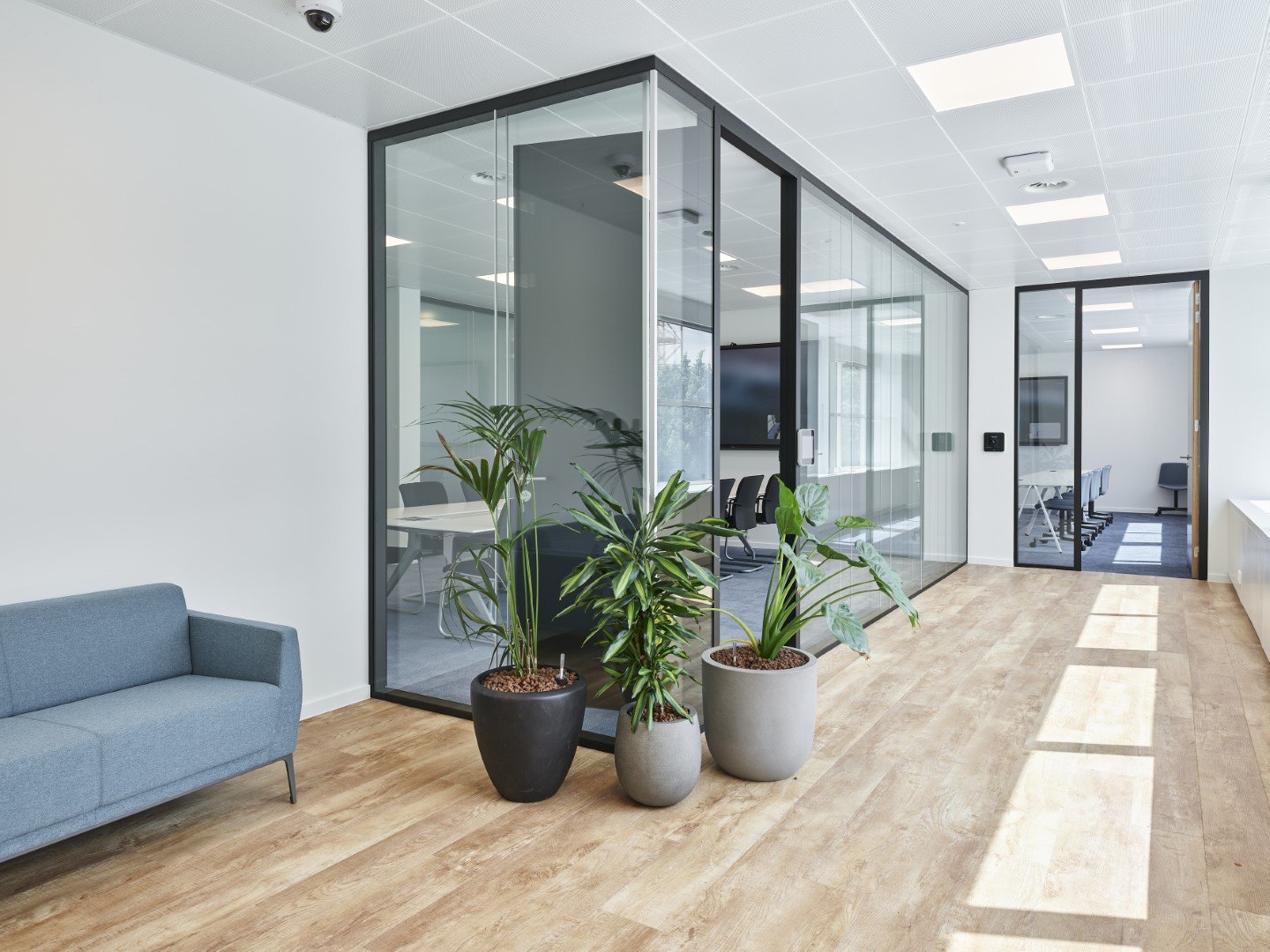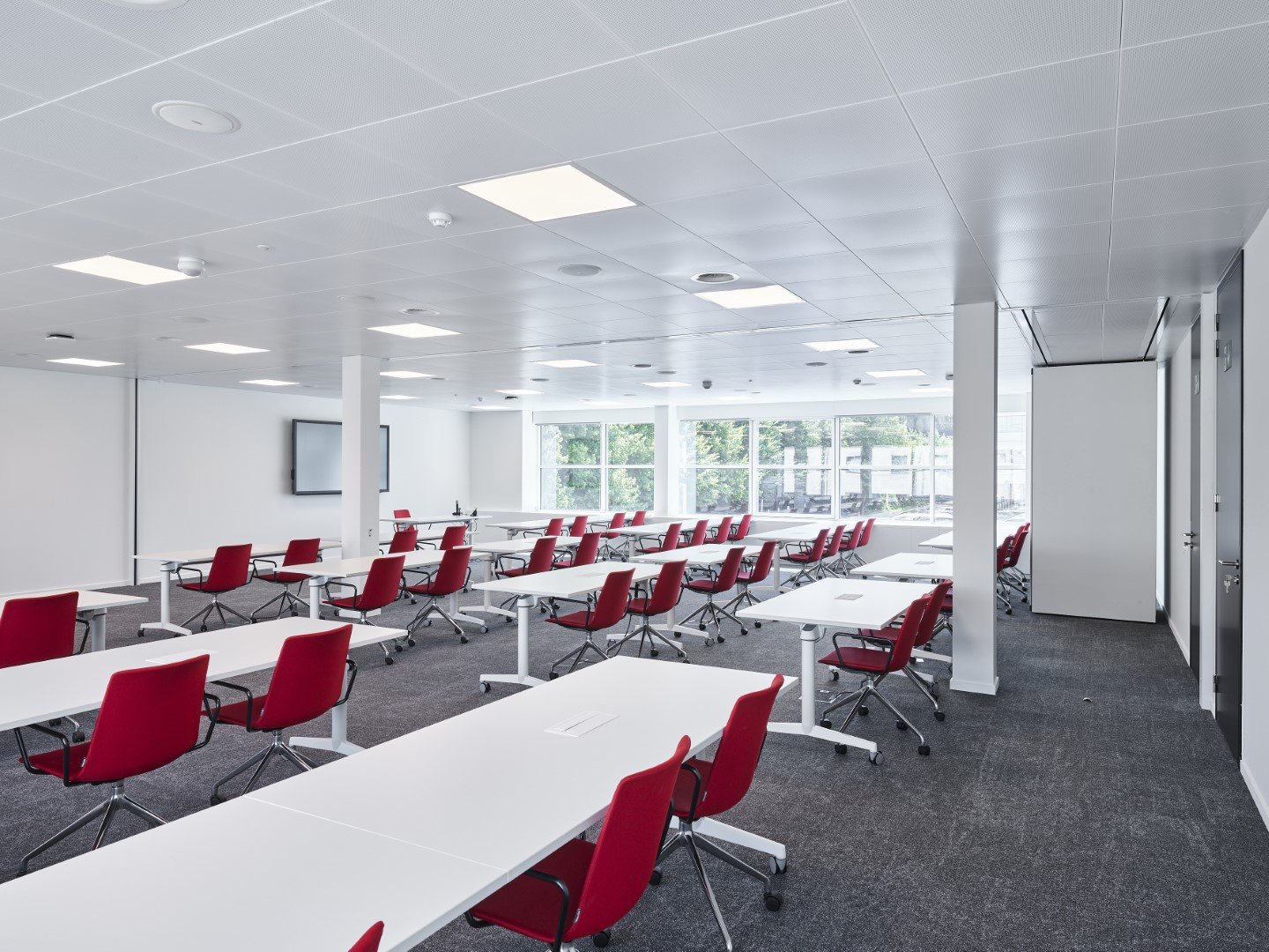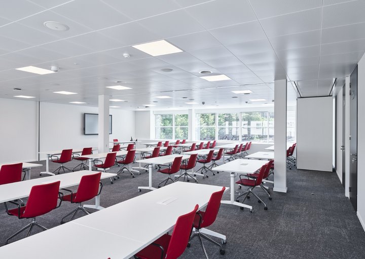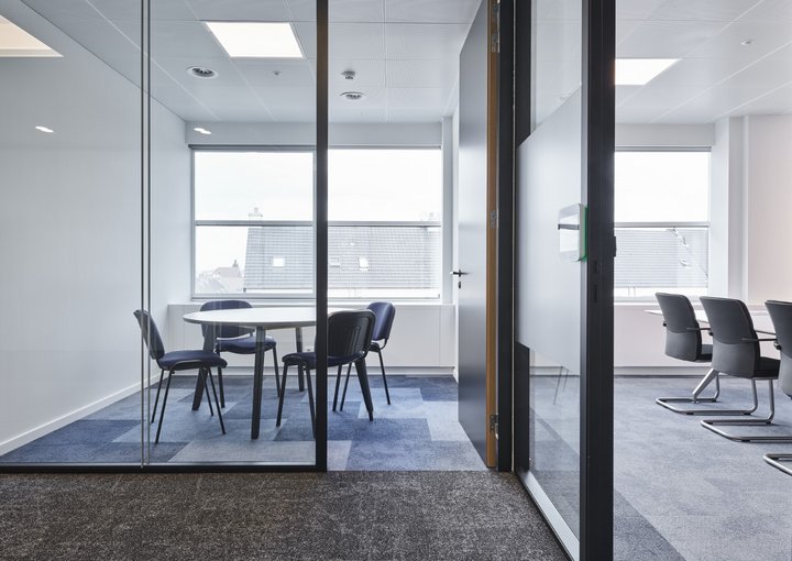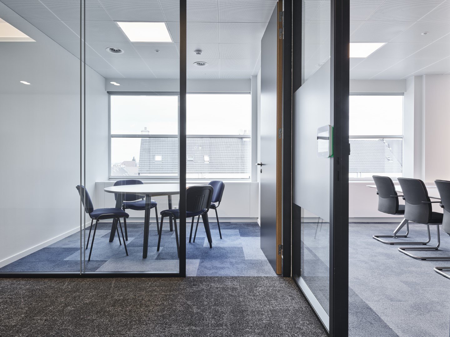 Total fit-out with plasterboard partitions, ceilings and luminaries, floor coverings (carpet - vinyl - epoxy), tiling, painting, electricity, sanitary, outside works (movable bollards, garage door, anti-burglary foil, security)