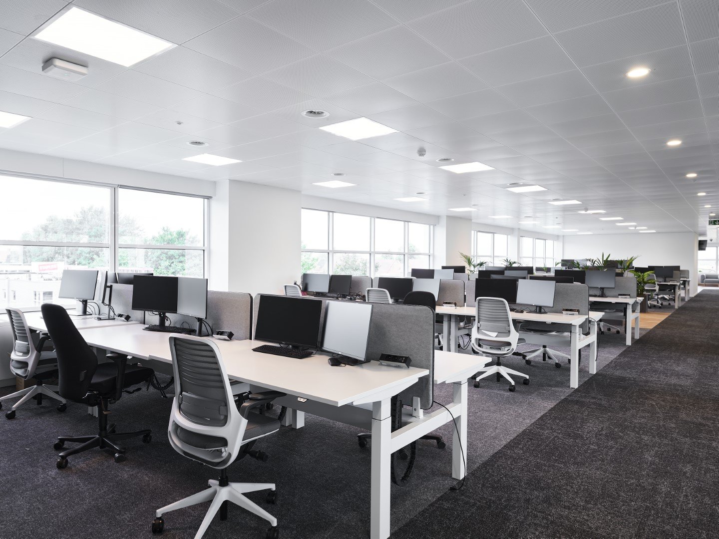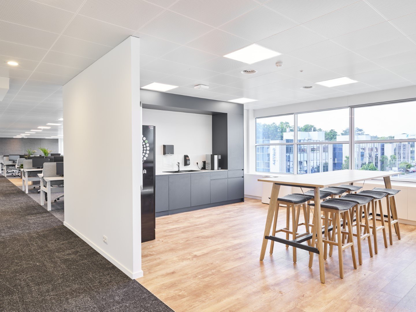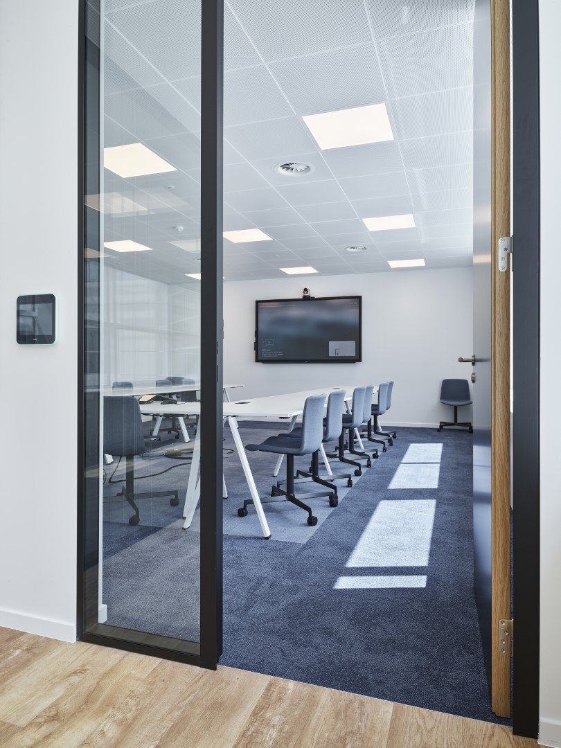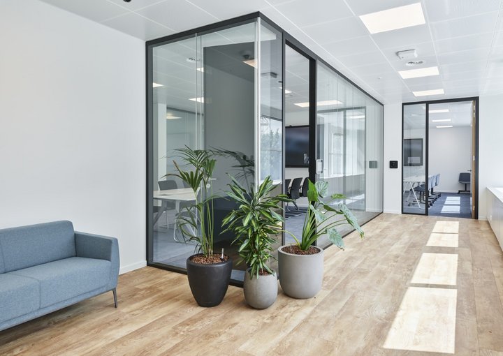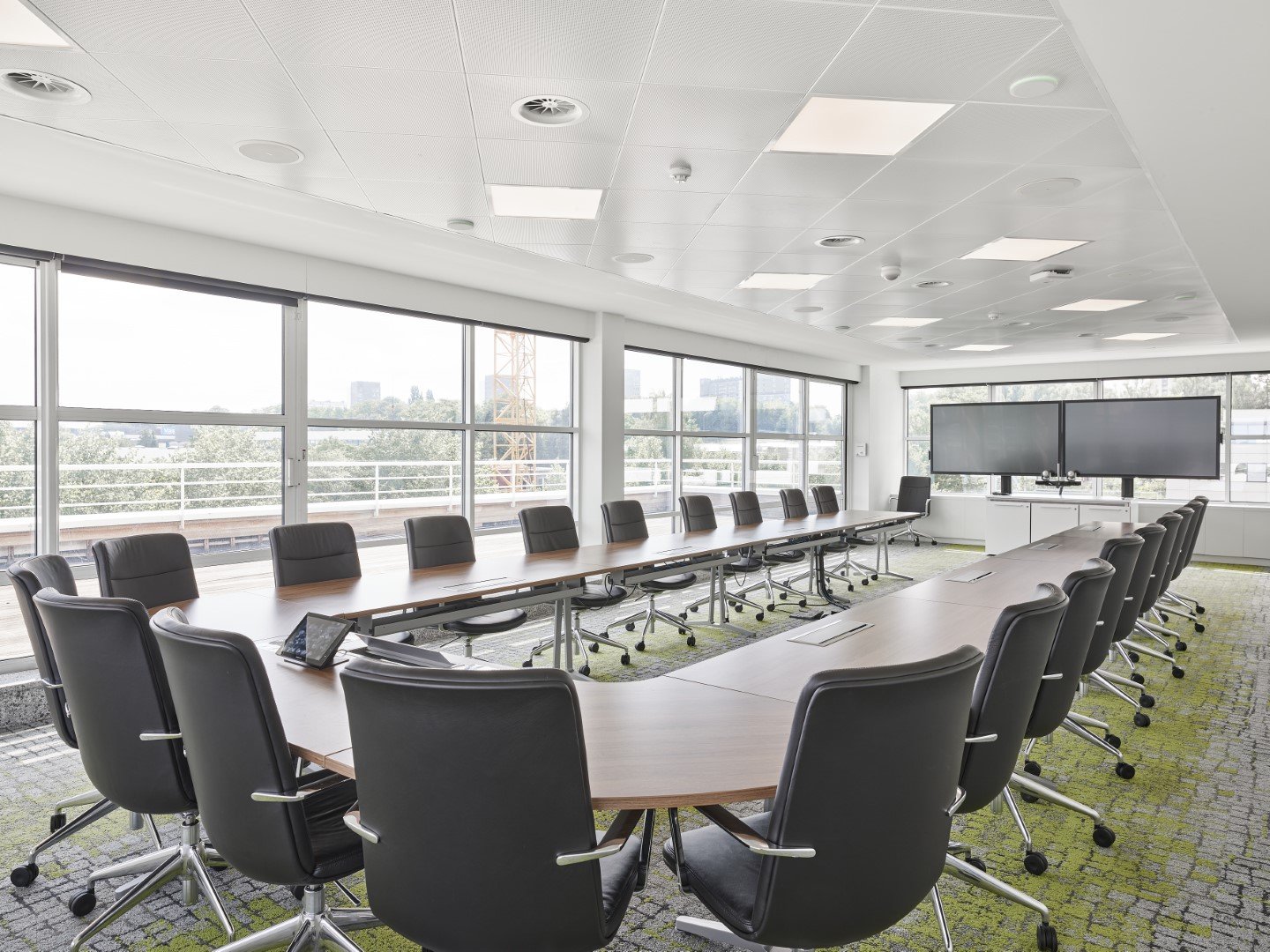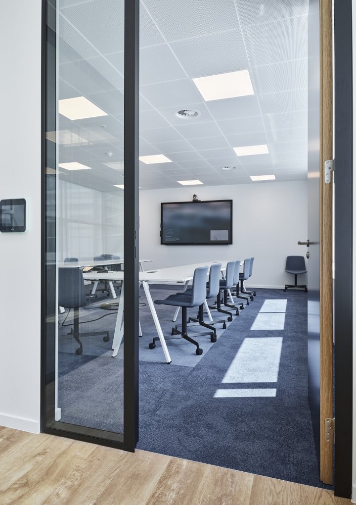 Total fit-out with plasterboard partitions, ceilings and luminaries, floor coverings (carpet - vinyl - epoxy), tiling, painting, electricity, sanitary, outside works (movable bollards, garage door, anti-burglary foil, security)