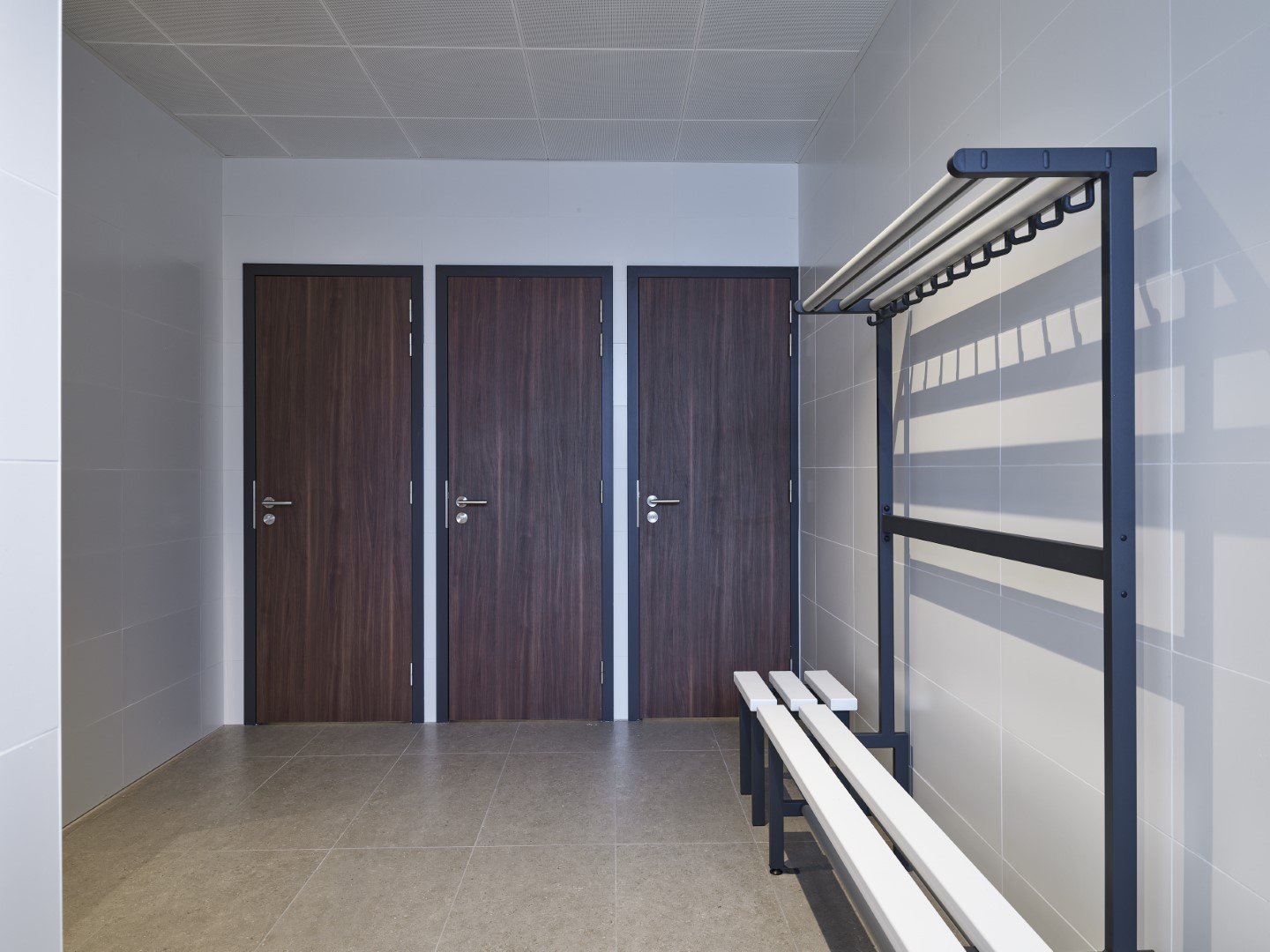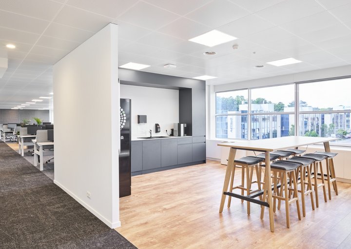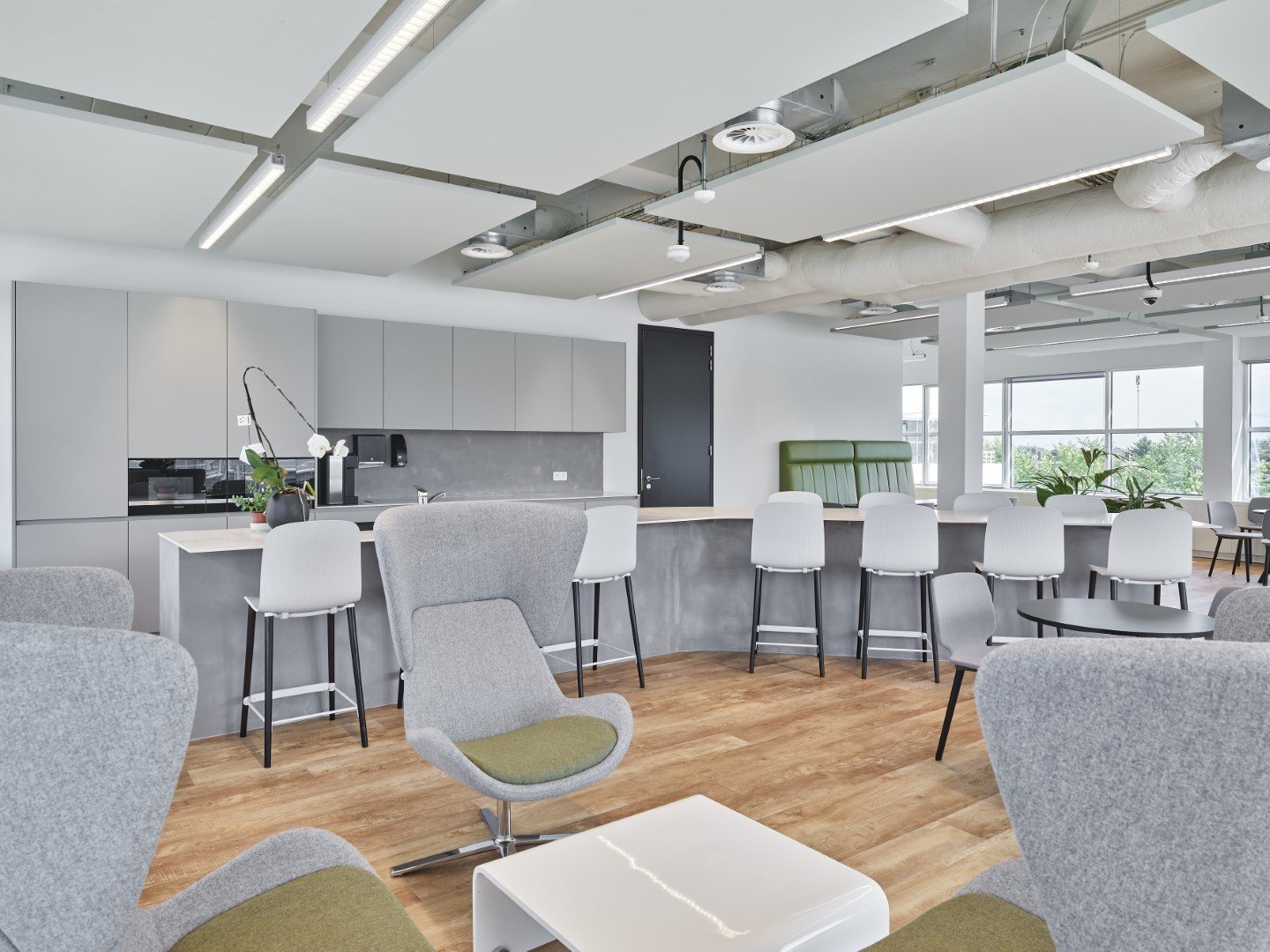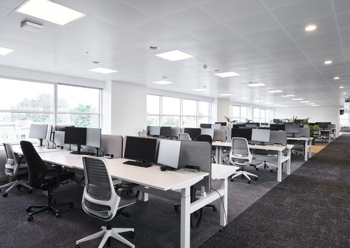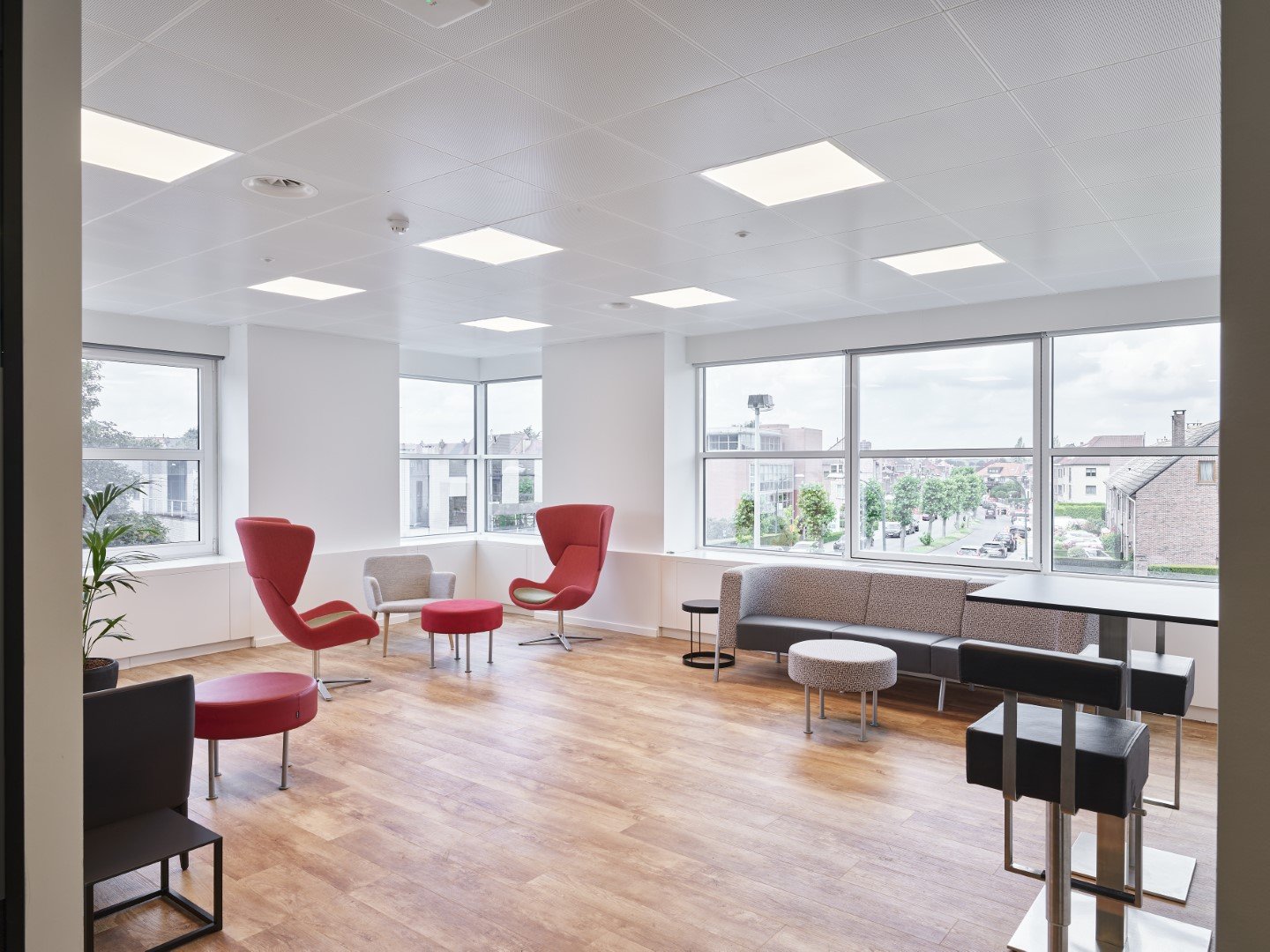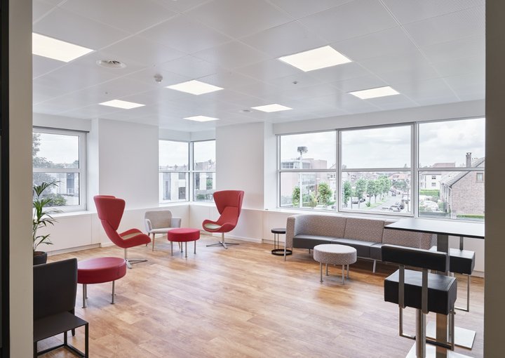 Total fit-out with plasterboard partitions, ceilings and luminaries, floor coverings (carpet - vinyl - epoxy), tiling, painting, electricity, sanitary, outside works (movable bollards, garage door, anti-burglary foil, security)