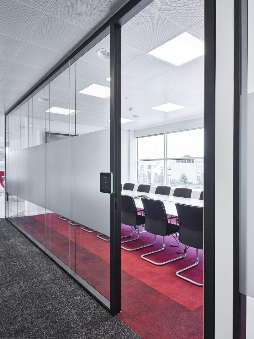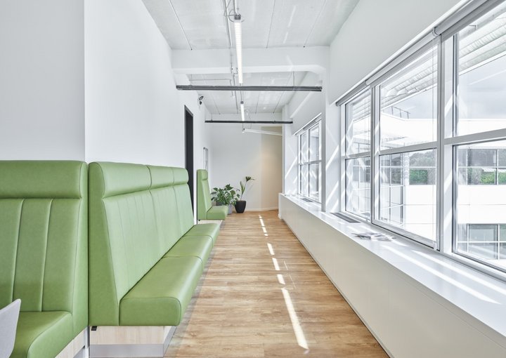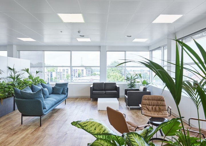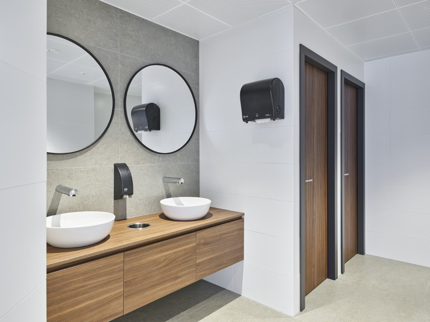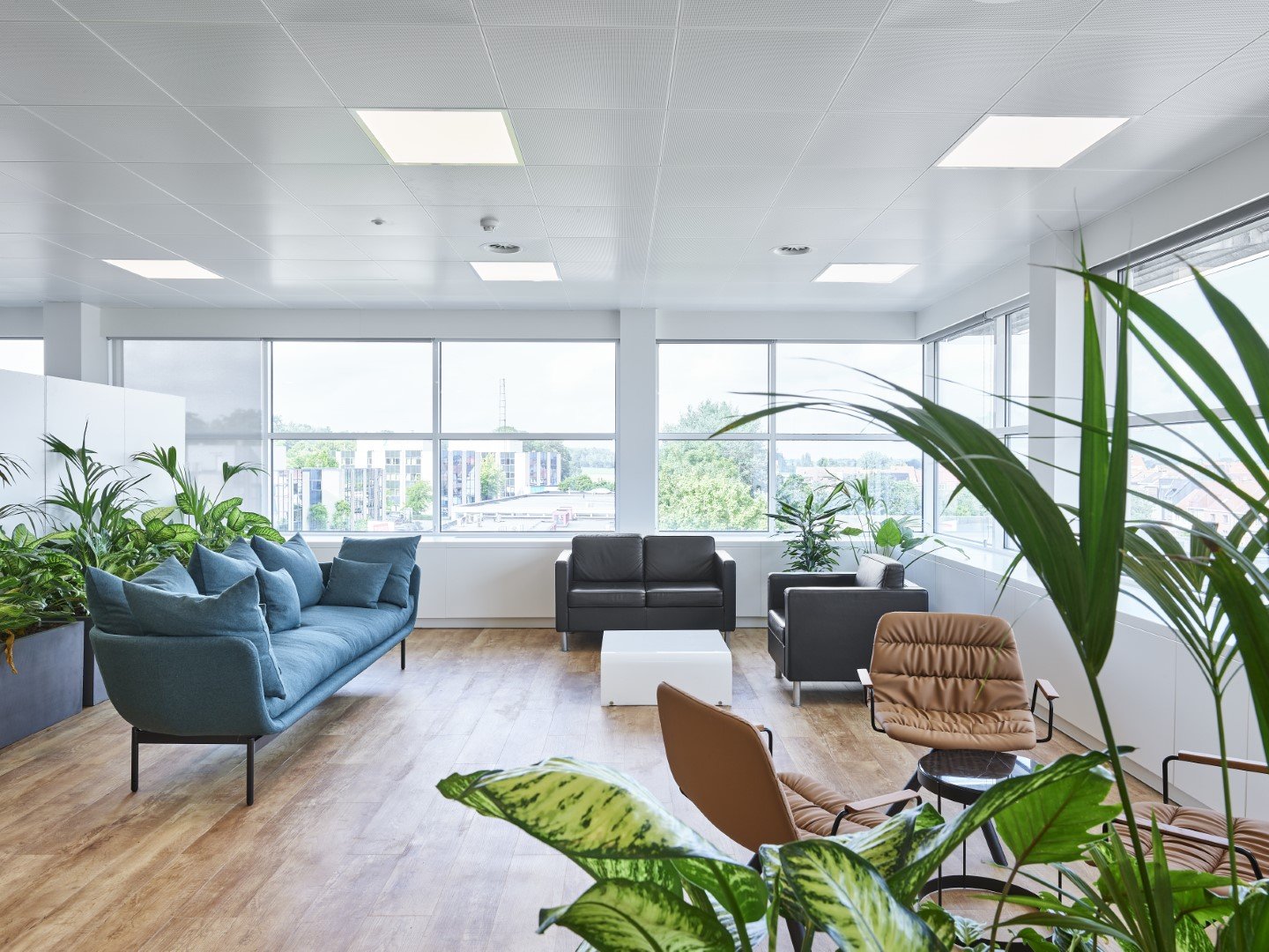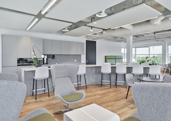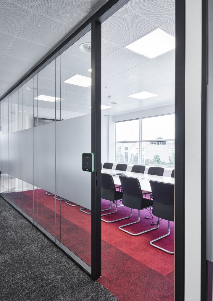 Total fit-out with plasterboard partitions, ceilings and luminaries, floor coverings (carpet - vinyl - epoxy), tiling, painting, electricity, sanitary, outside works (movable bollards, garage door, anti-burglary foil, security)