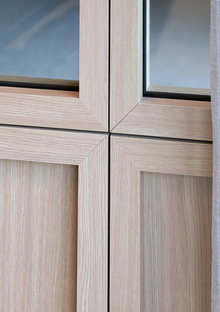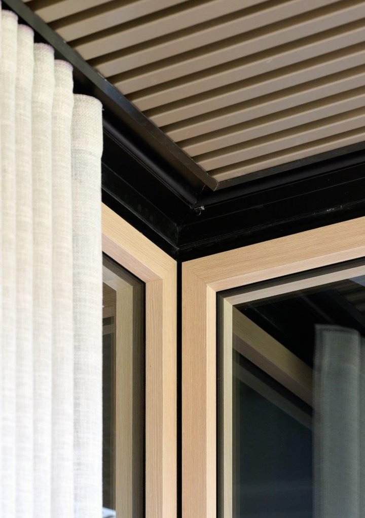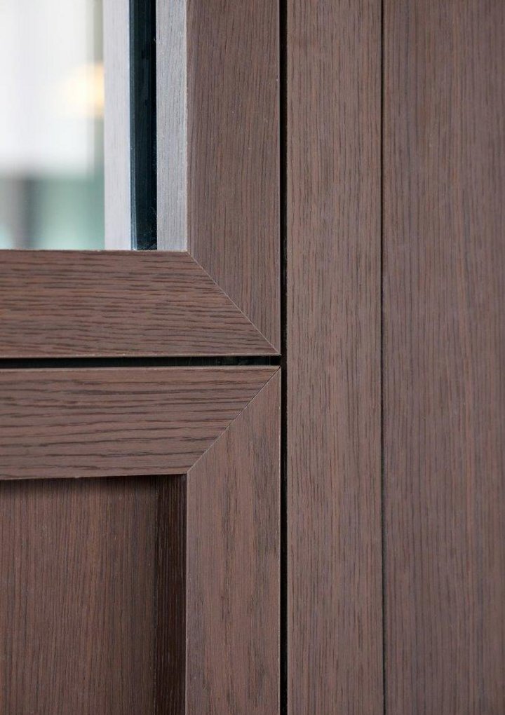 Our JB 2000 FRAME WOOD wall, with its warm wood look, levels up the overall aesthetic. Every panel, door leaf, and window frame features wood print HPL, achieving a visual harmony otherwise impossible to create with solid wood’s irregular grain.