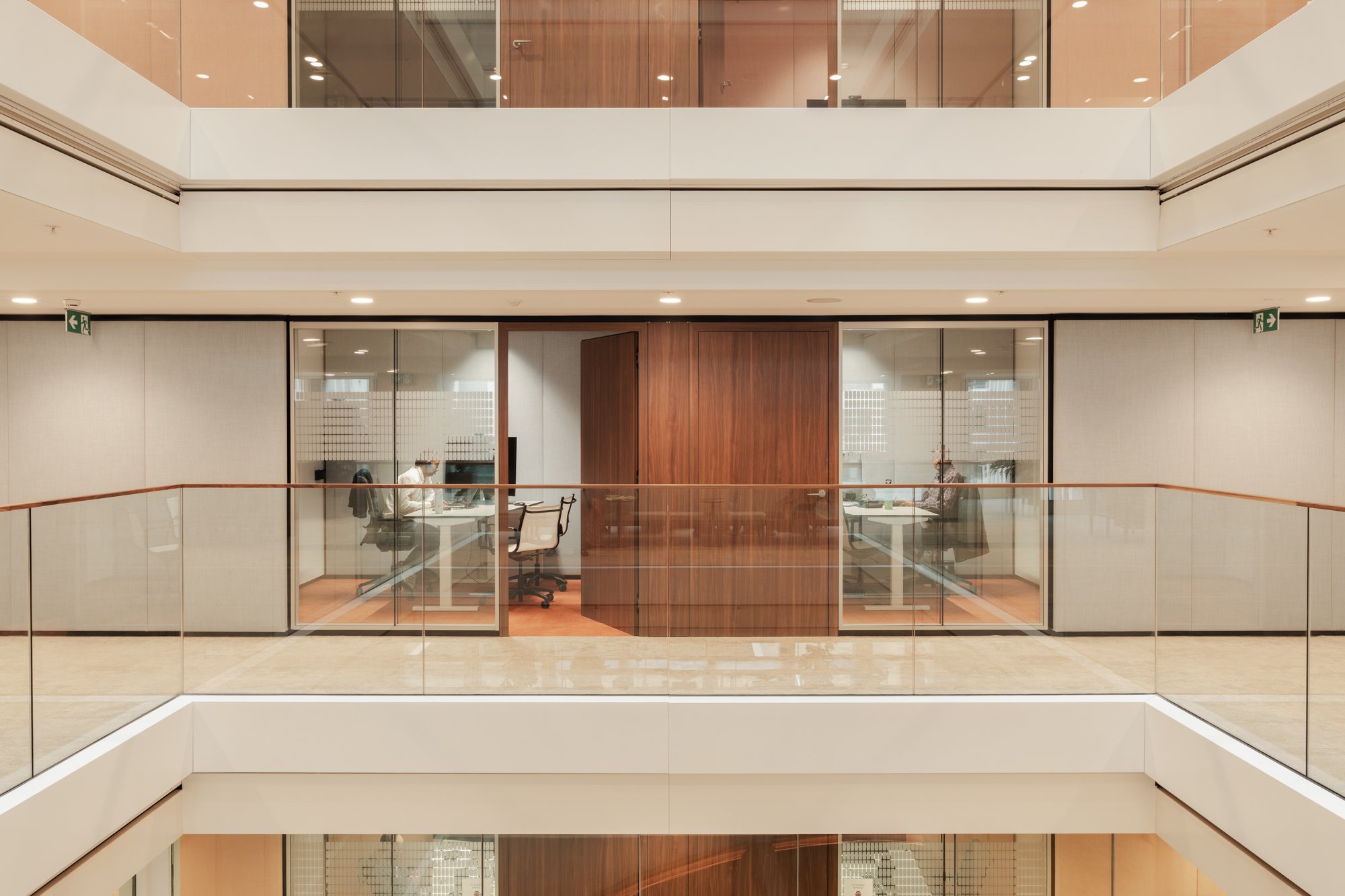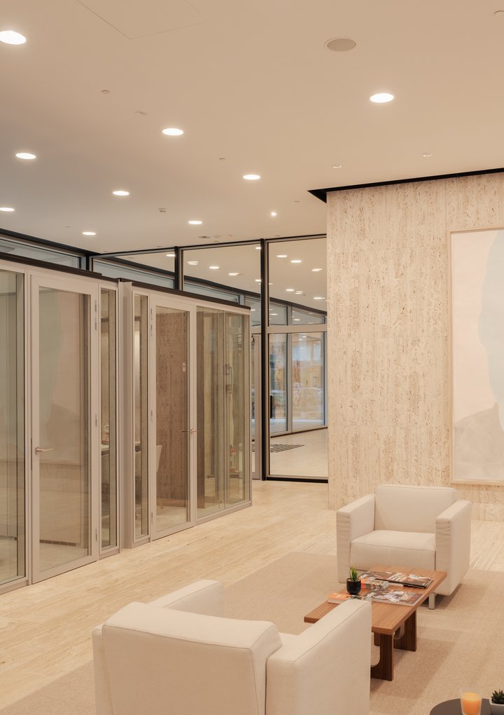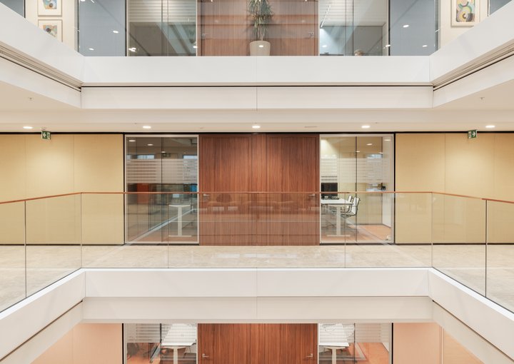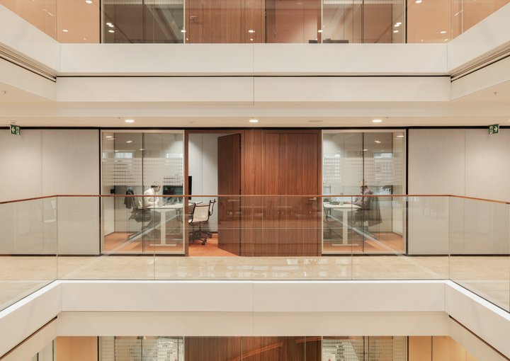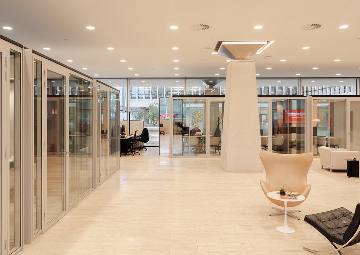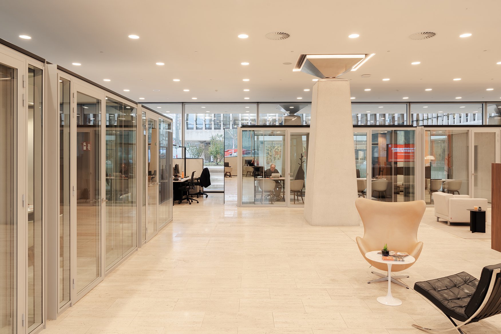 In addition to the office floors, the ING bank branch on the ground floor was equipped with a series of interconnected JB QBE modular units, providing acoustically isolated customer and consultation spaces within the open space.