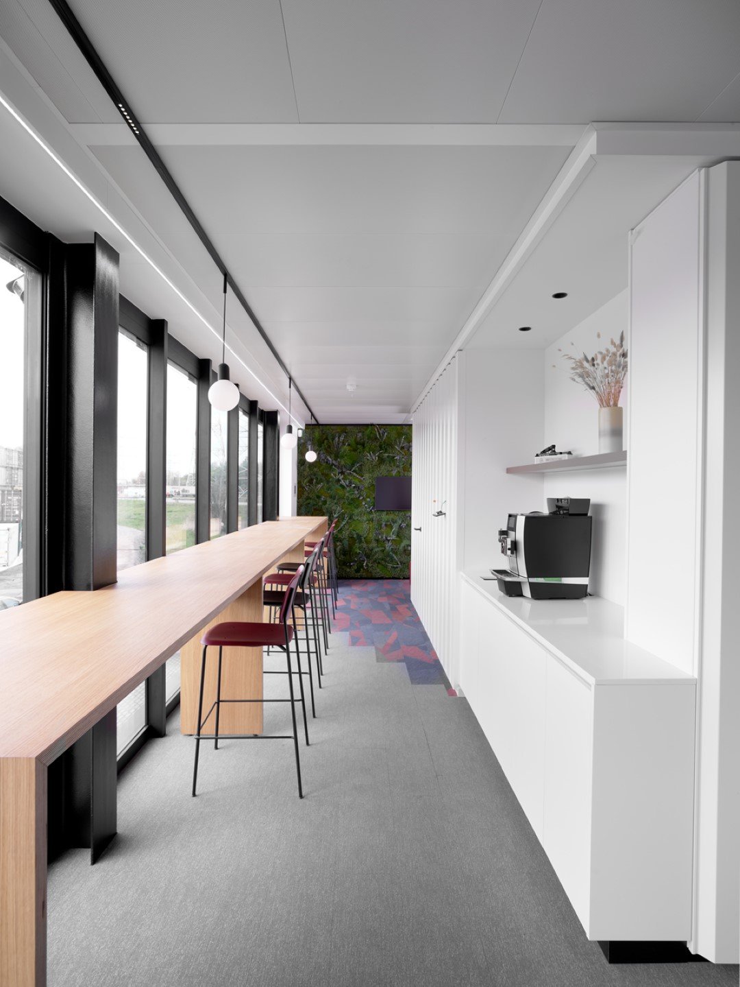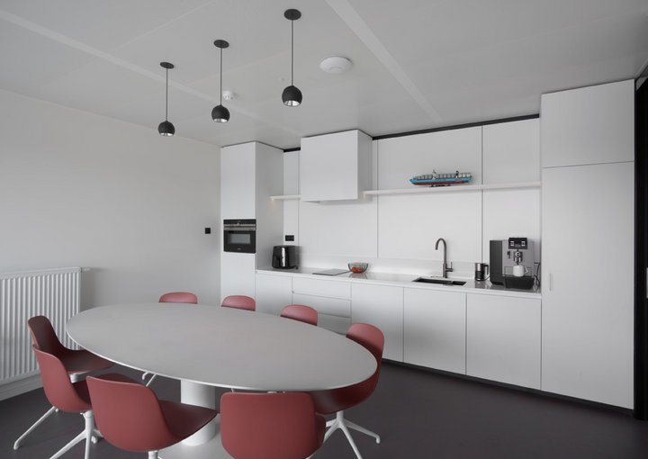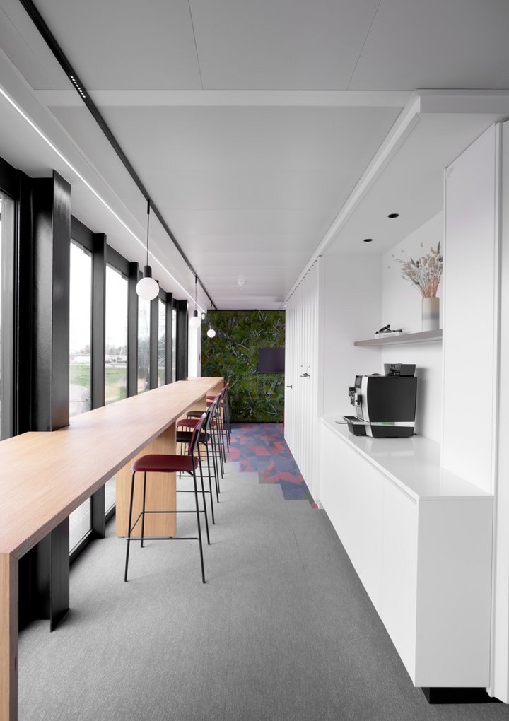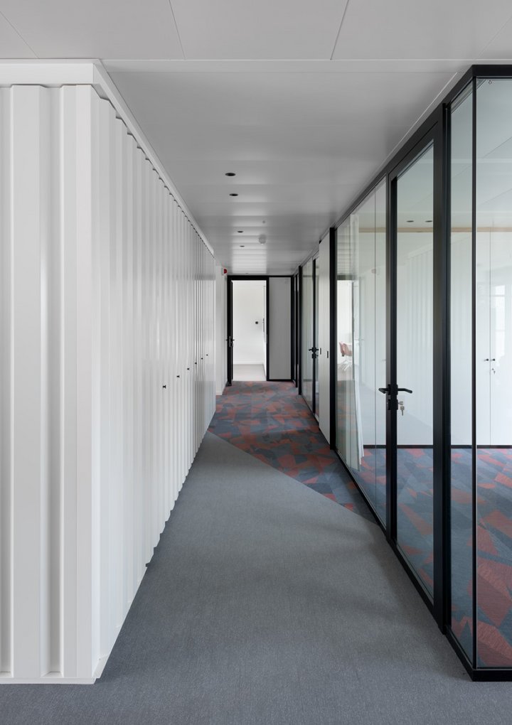 The new building consists of 4 floors, a warehouse and also an integrated private residence. A striking feature of this project are the custom-made container wall panels.