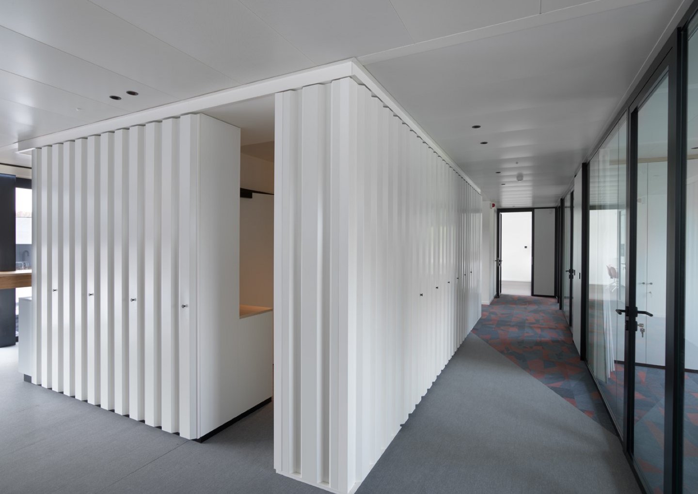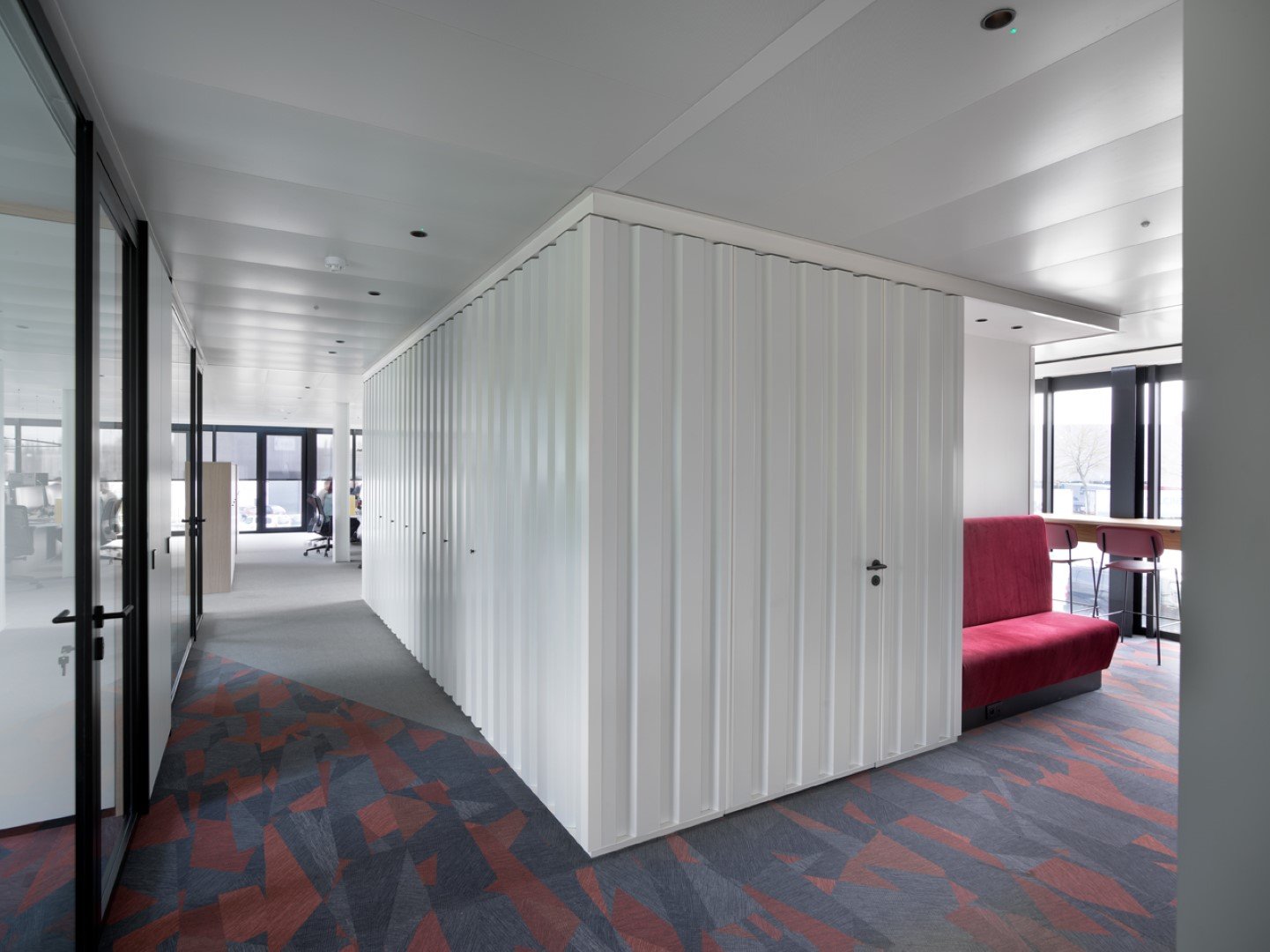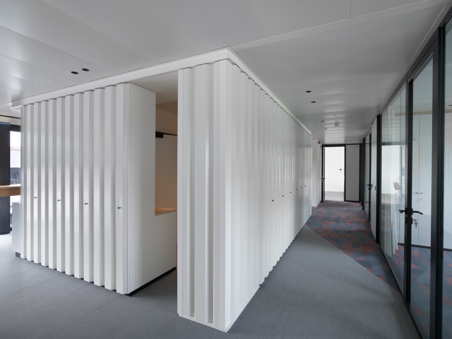 Alongside our relocatable partitions (JB 2000 and JB 4000) and JB COOL climate ceilings, Beddeleem also handled the plasterboard partitions, the floor finishes (carpet, vinyl and tiles), the furniture from collections like JB LOCKERS, JB STORE and JB DESK, the customized furniture and the painting.