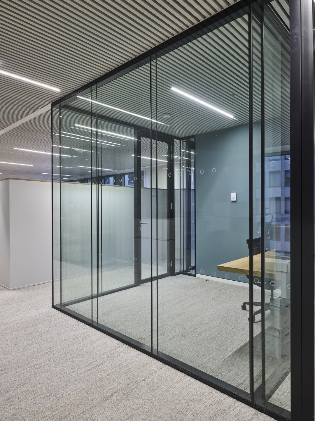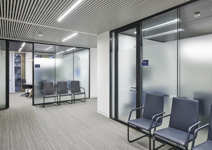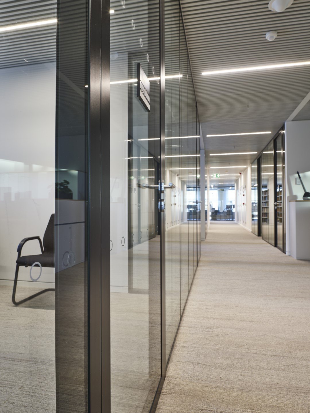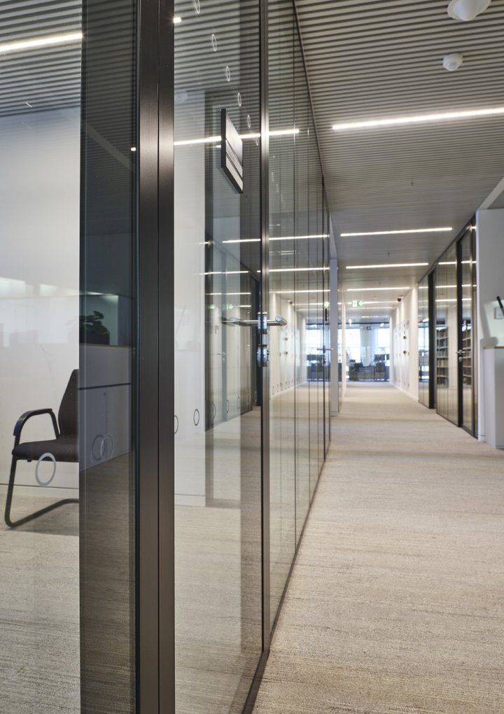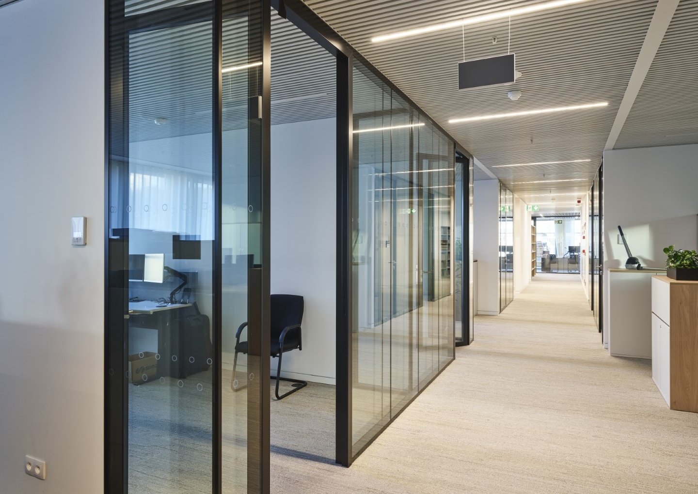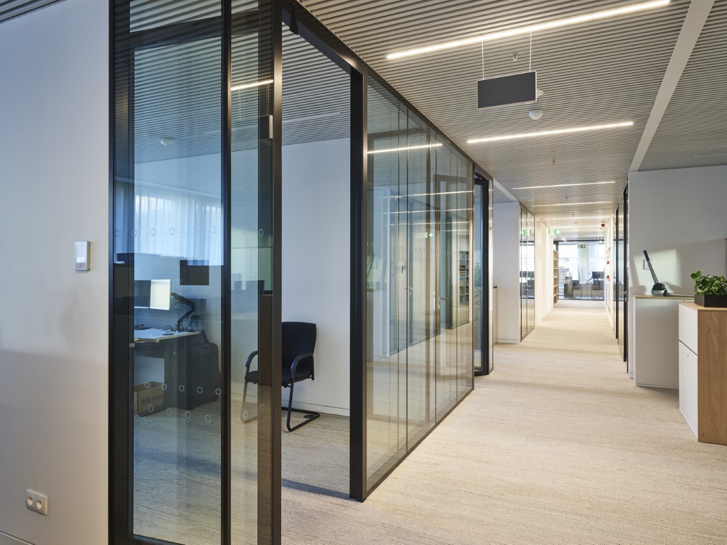 A total of 3 floors in the new Tweed office building in Brussels were completely furnished with JB PURE 100 relocatable partitions in combination with plasterboard partitions. The entrance areas were equipped with double doors in JB FIREGLASS partitions. JB ABSORB WALL partitions with Kwadrat upholstered panels provide the necessary acoustics.