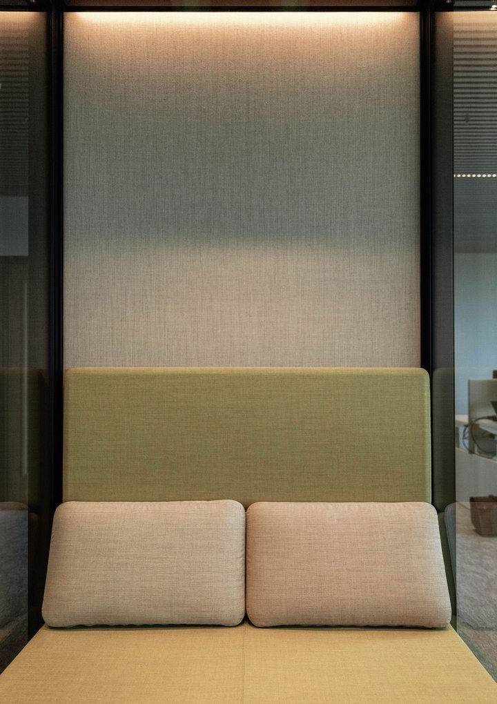 The JB QBE boxes serve as modular, acoustic workspaces. These stand-alone units provide Puilaetco with flexible, private spaces that meet both collaborative and individual work needs. The boxes are equipped with state-of-the-art acoustic solutions that provide insulation from external disturbing noise.