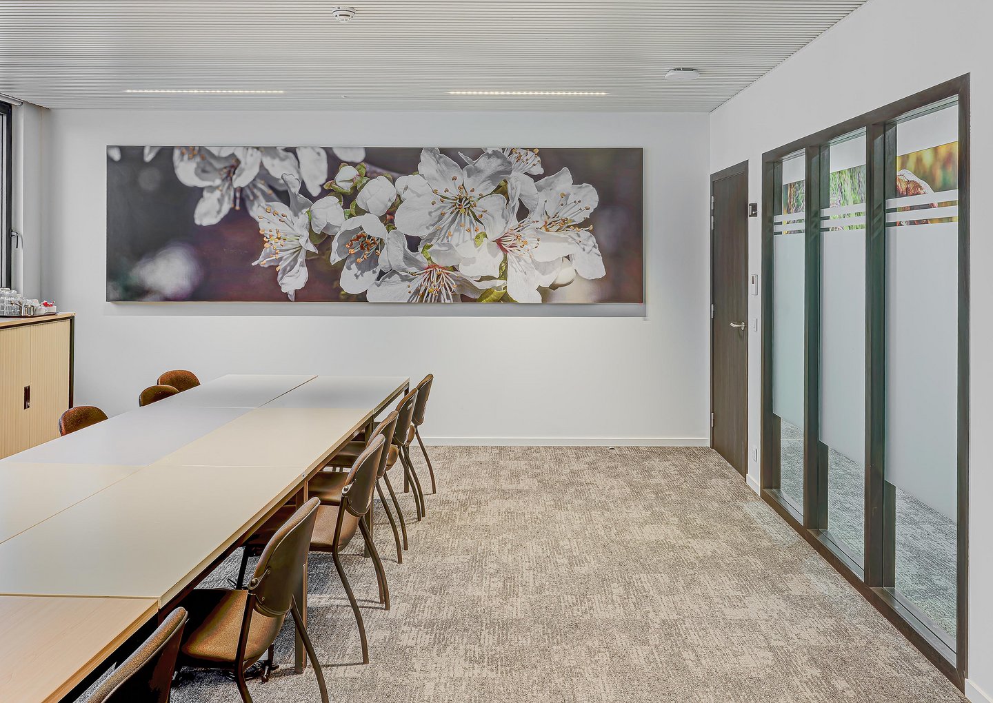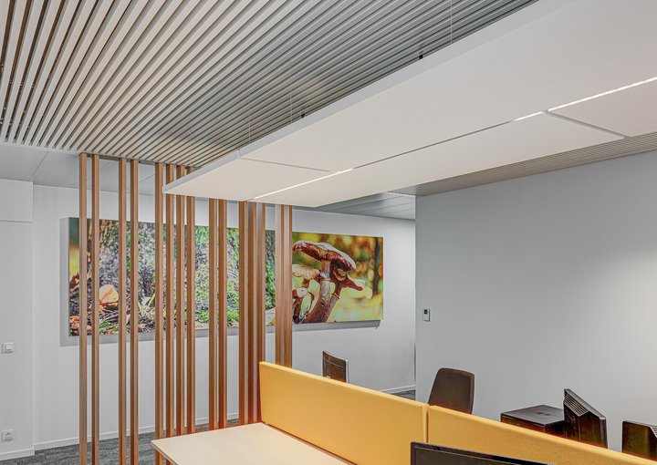 A striking feature of the interior design is the strong focus on acoustic comfort, achieved through tailor-made solutions from the JB ABSORB range, including project-specific free-hanging acoustic ceiling baffles.