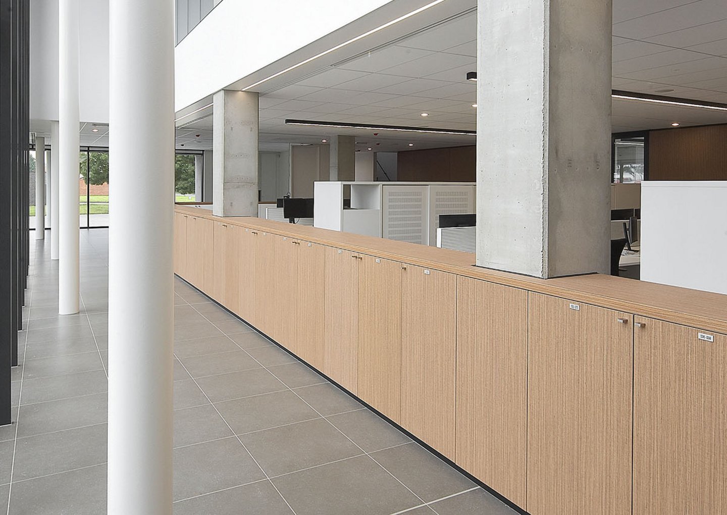 The new Transport Mervielde office building is finished using system ceilings, JB 2000 partitions, JB PURE partitions, fixed plasterboard walls, JB DOOR FIX doors, JB STORE cabinets, and a range of other fittings made to measure for the customer. Beddeleem’s project leader worked closely with Steven Vangheluwe’s design practice and with architect Mieke Verhoest.