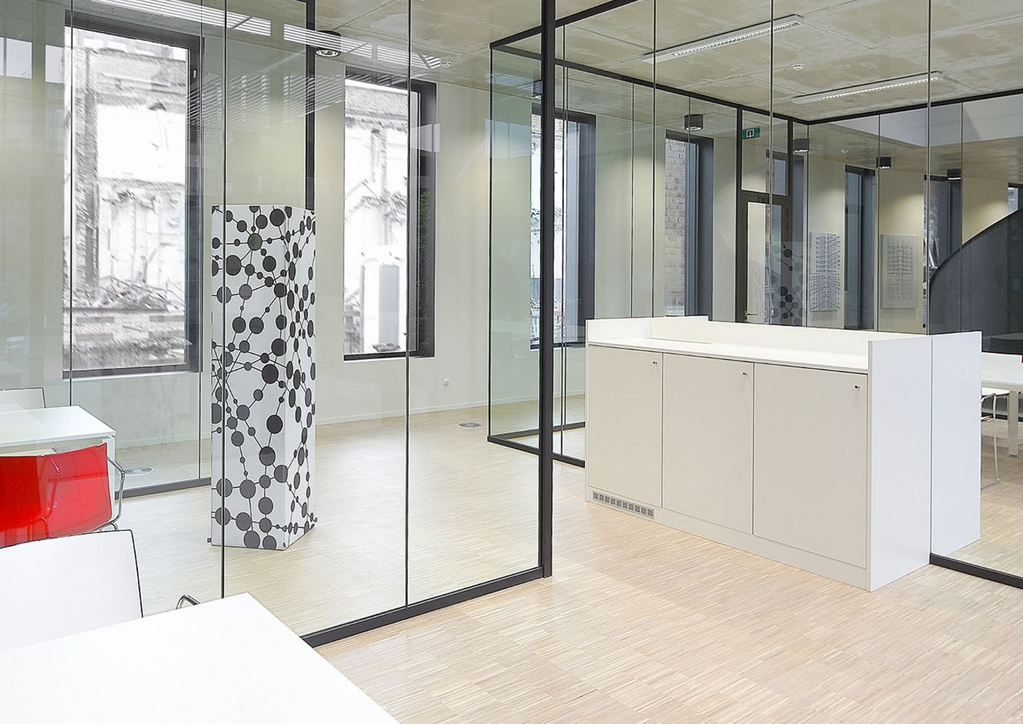 The JB 4000 wall-high glass partition by Beddeleem is distinguished from other similar partitions by its modularity and mobility, thanks in part to its intelligent top and bottom profiles and its silver cradle-to-cradleTM certification.