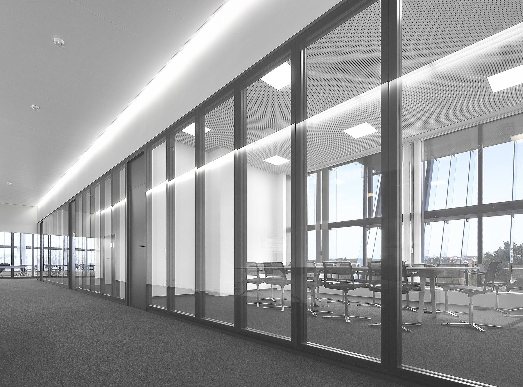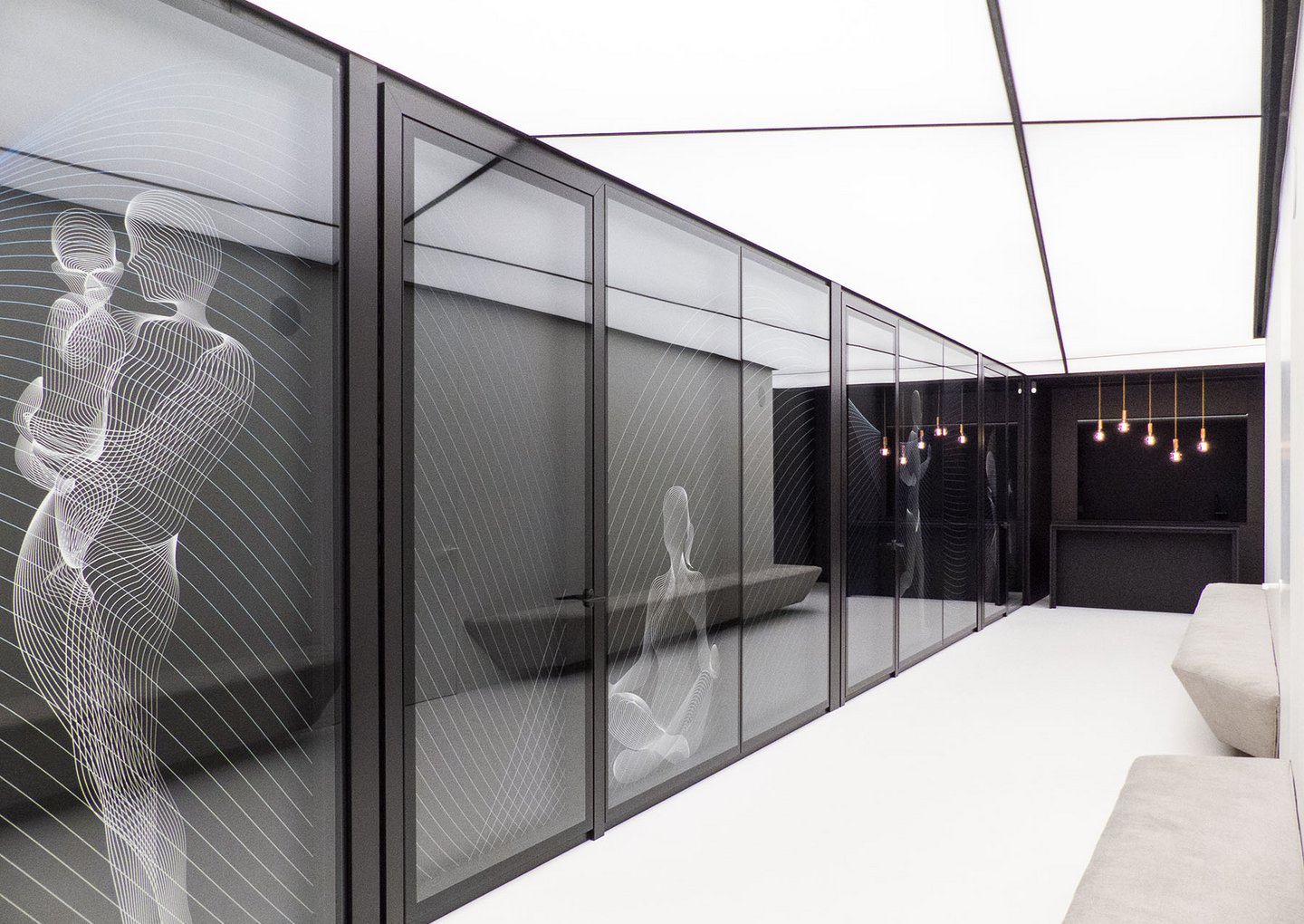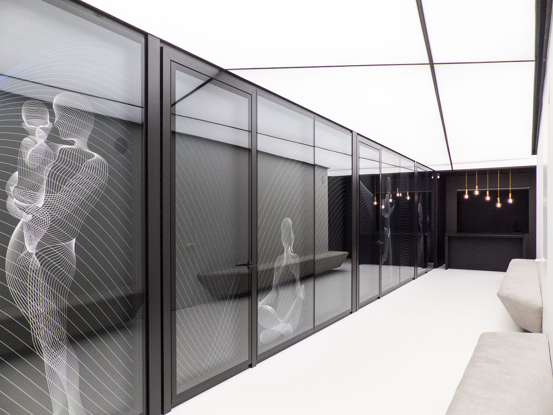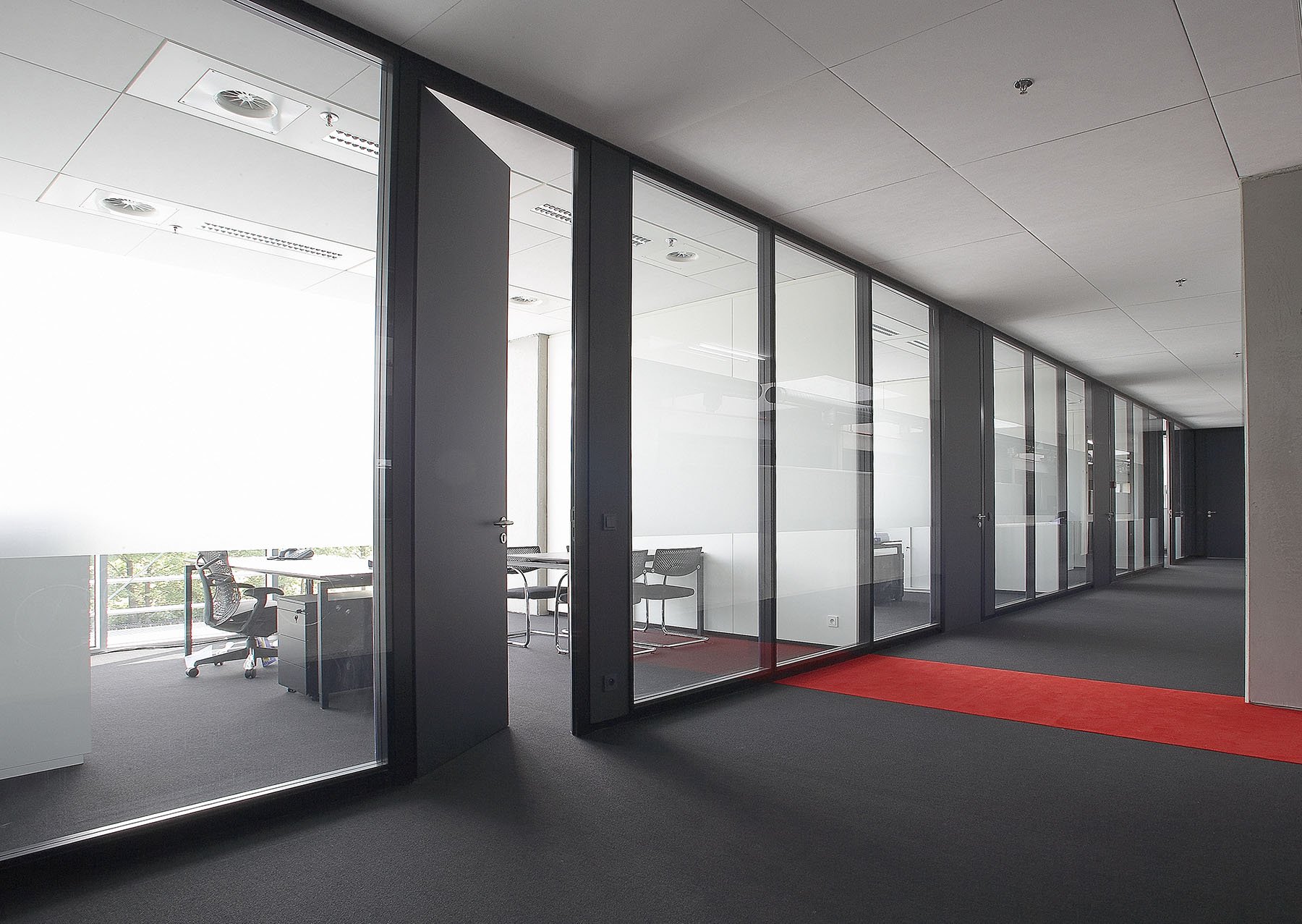 The system consists of 2-shell window frame modules with glued glass that reduce placing and relocating the wall to child's play. Thanks to the glued glass, all parts of the wall are in the same plane, creating a contemporary and sleek look (the partition plane is entirely made of glass).