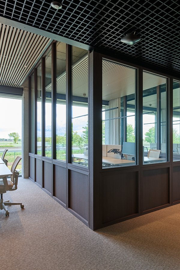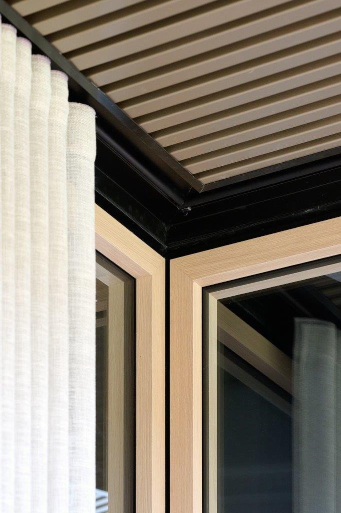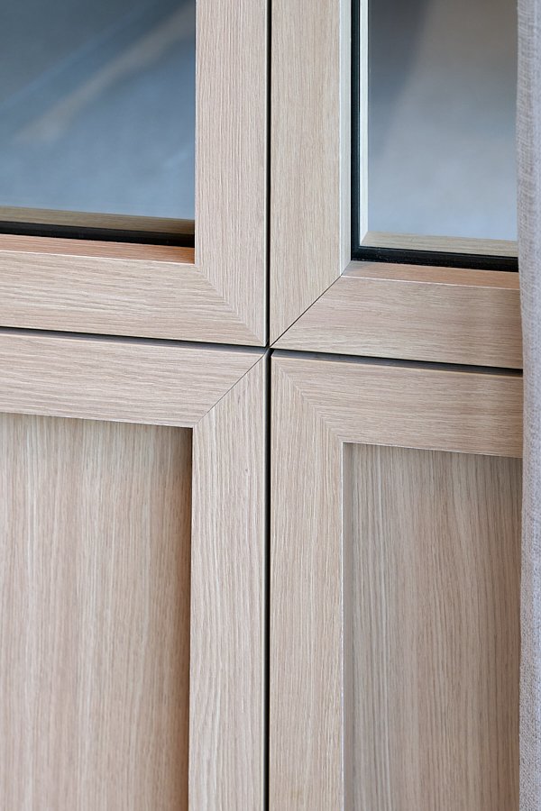 Our JB 2000 FRAME WOOD wall, with its warm wood look, levels up the overall aesthetic. Every panel, door leaf, and window frame features wood print HPL, achieving a visual harmony otherwise impossible to create with solid wood’s irregular grain.